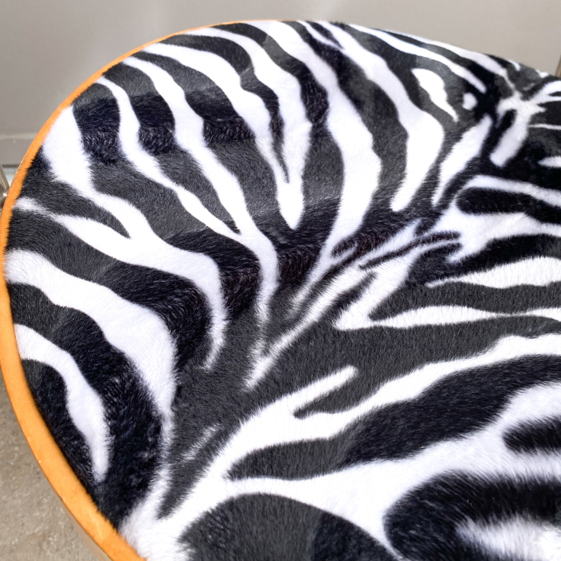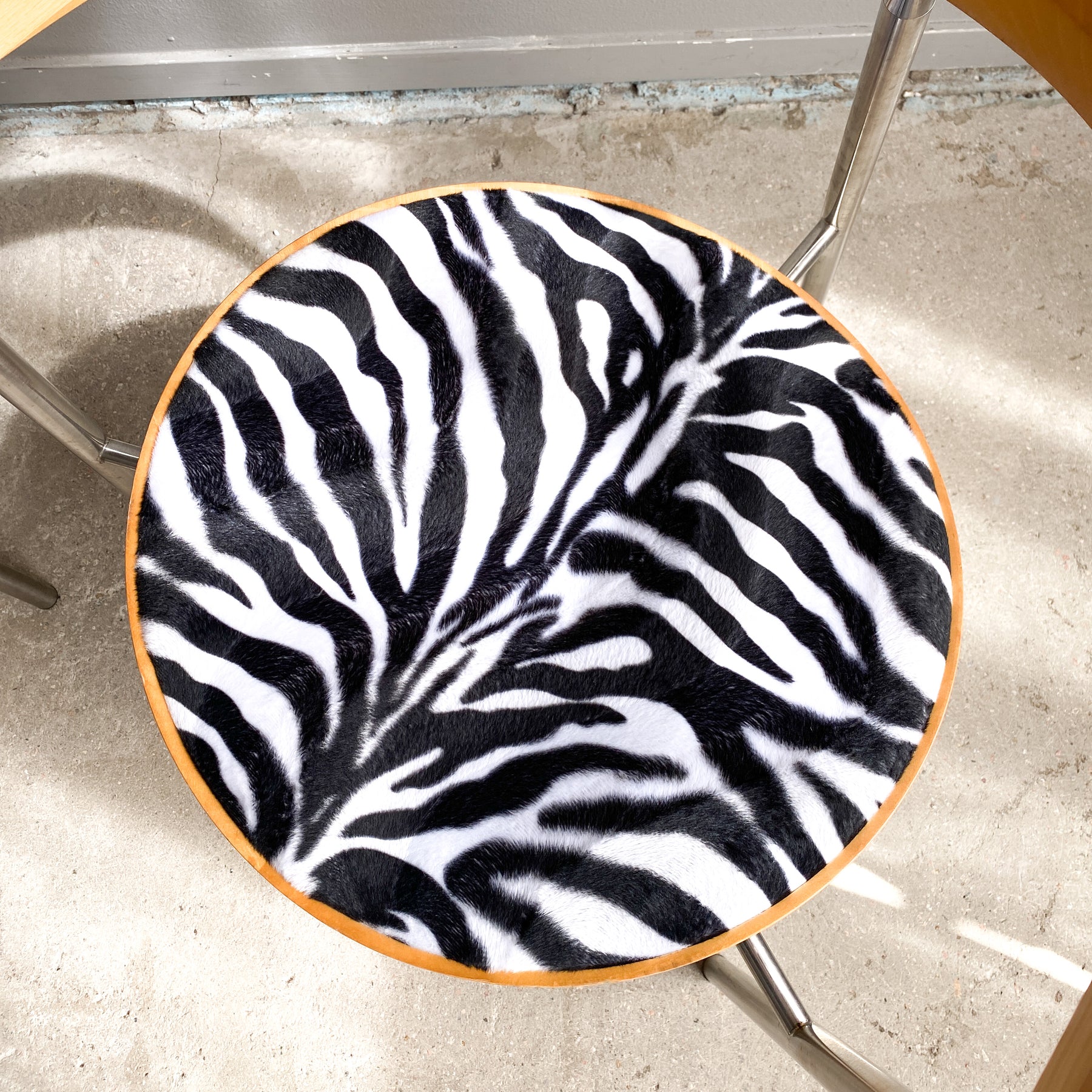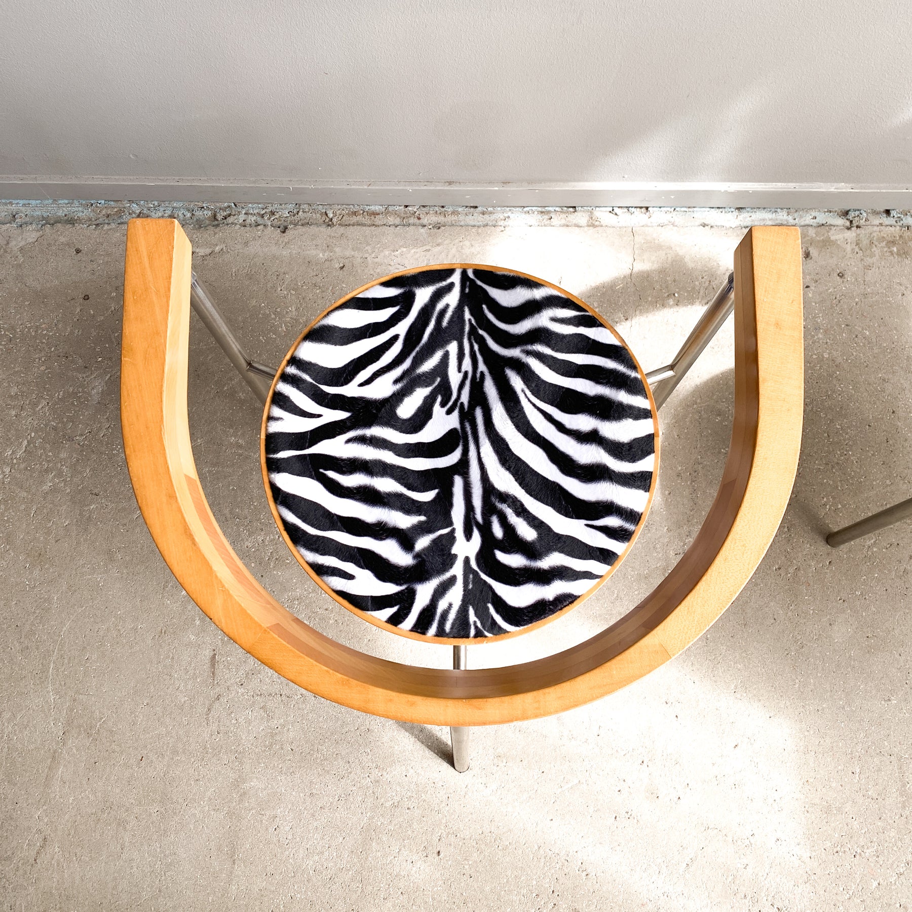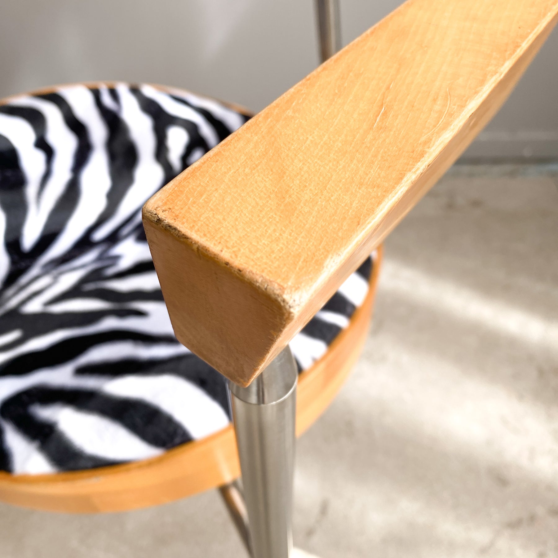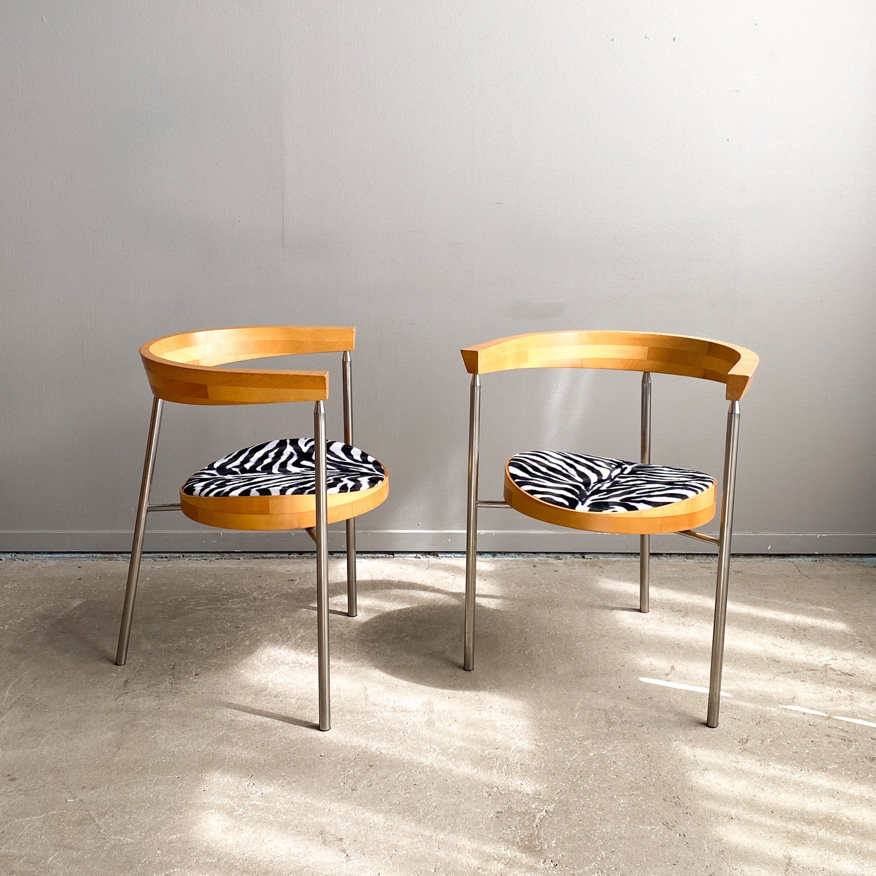Paret karmstolar i borstad krom och björk, 80/90-tal. Nyklädda sitsar i zebra fuskpäls tyg. Märkta undertill Bodil W.