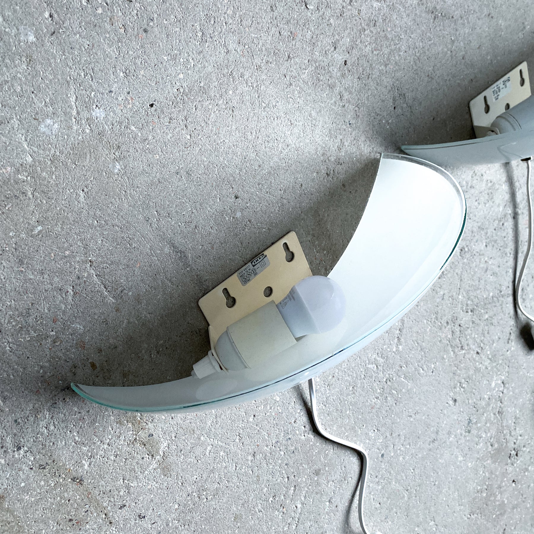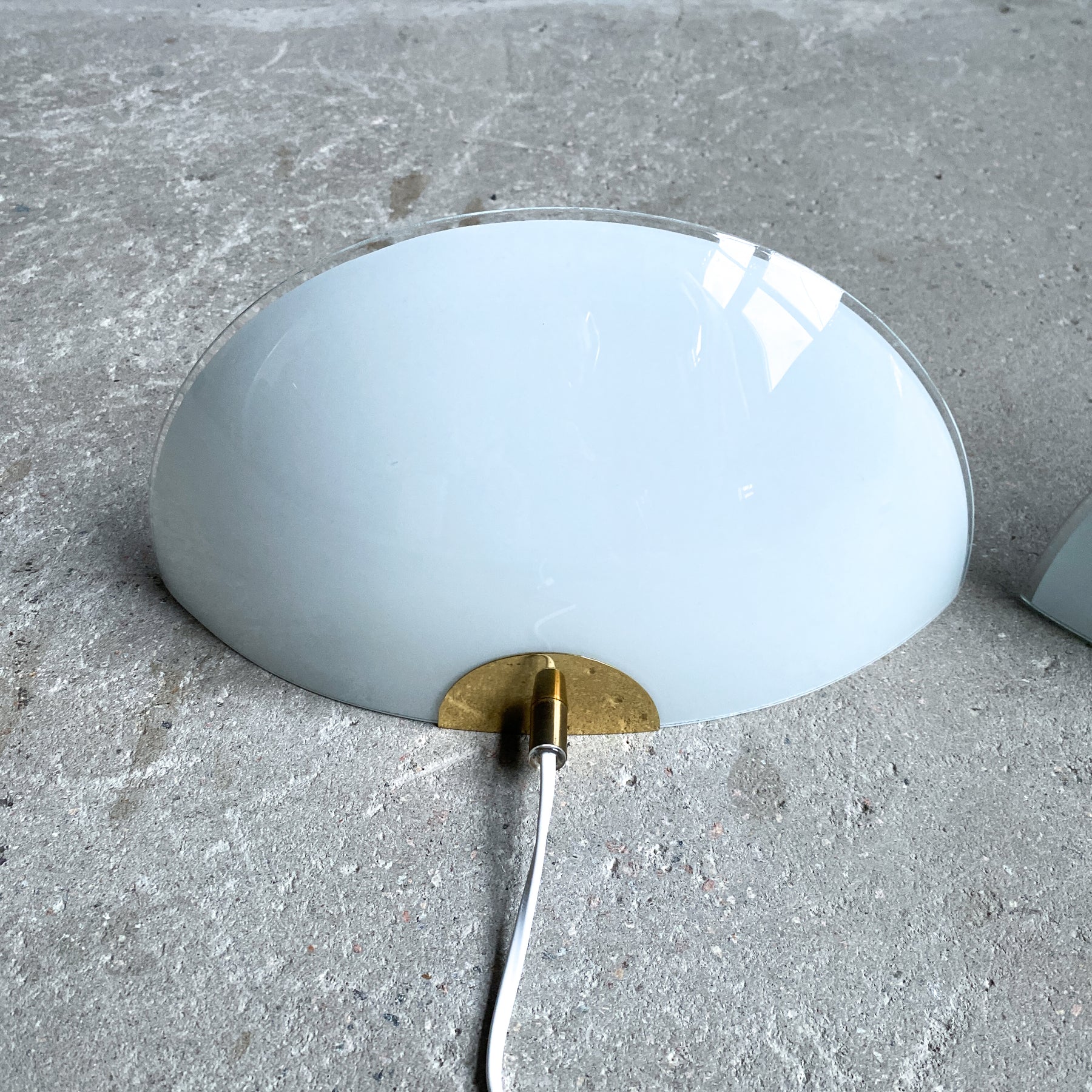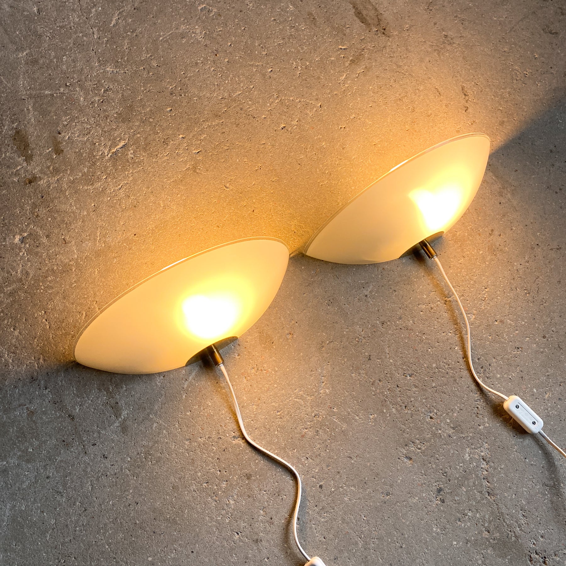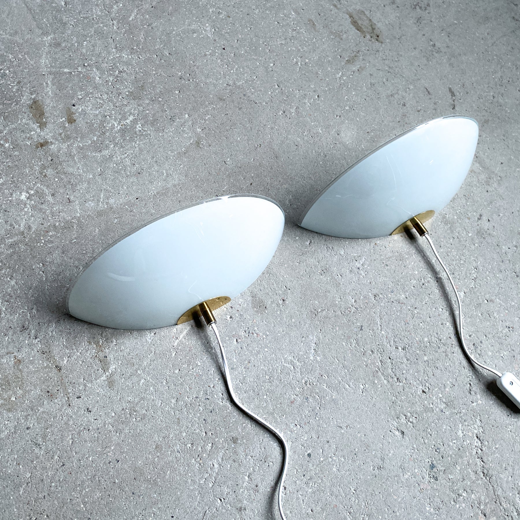 Två uplight vägglampor från Ikea i opalfärgat glas och mässing. Modellen heter "Solist" och kom 1993. Tillskriven Karin Mobring. Strömbrytare på vit sladd med platt eurokontakt.