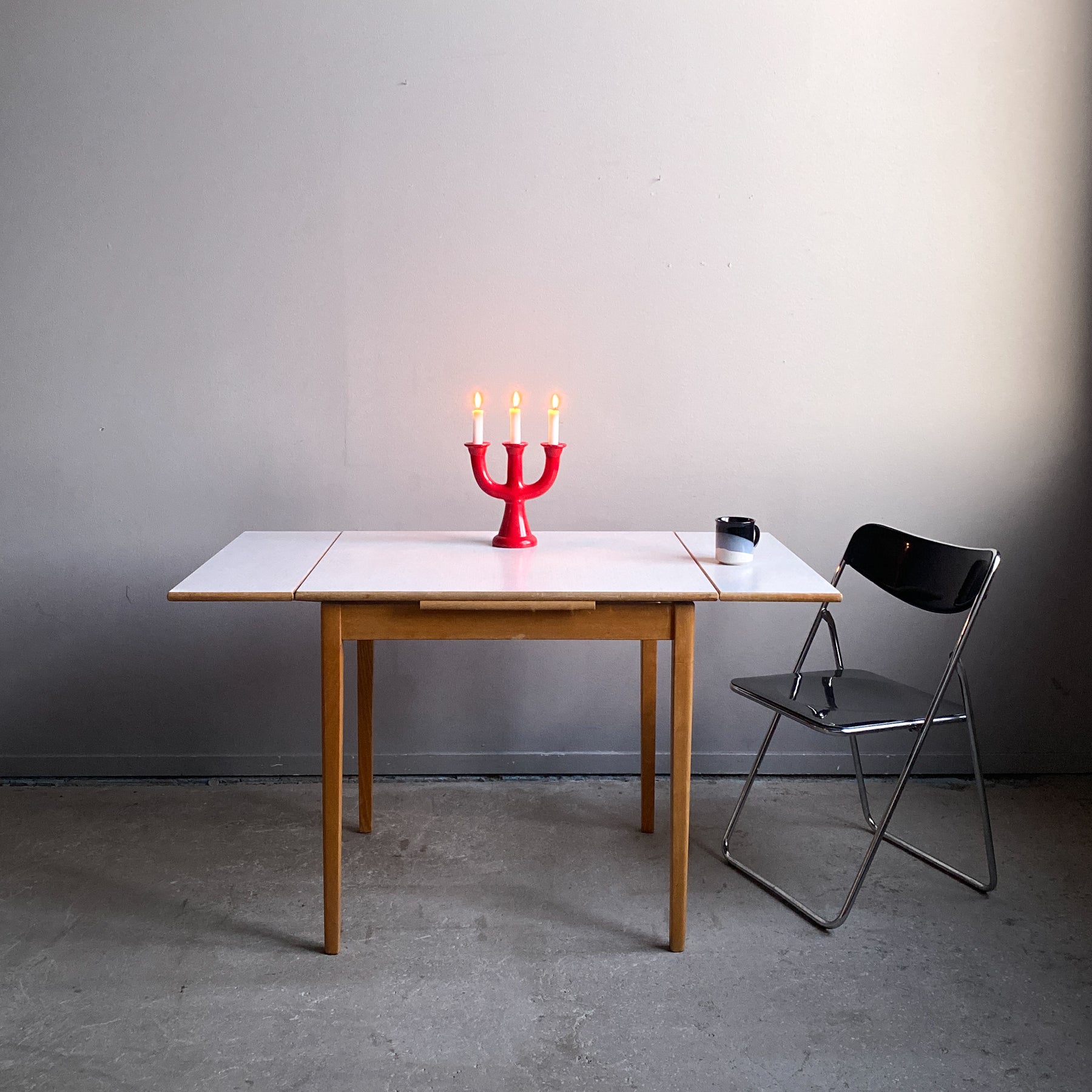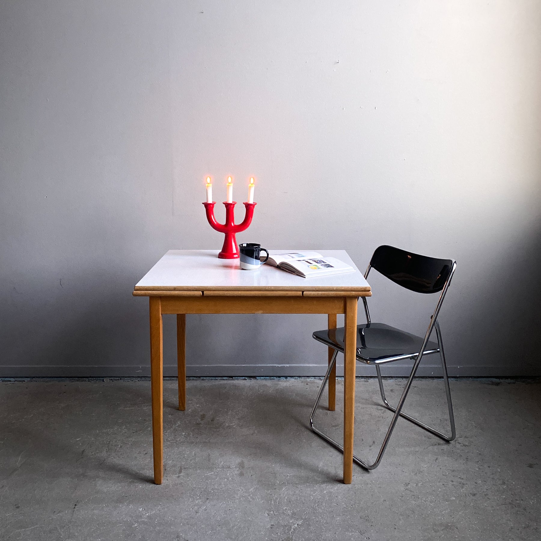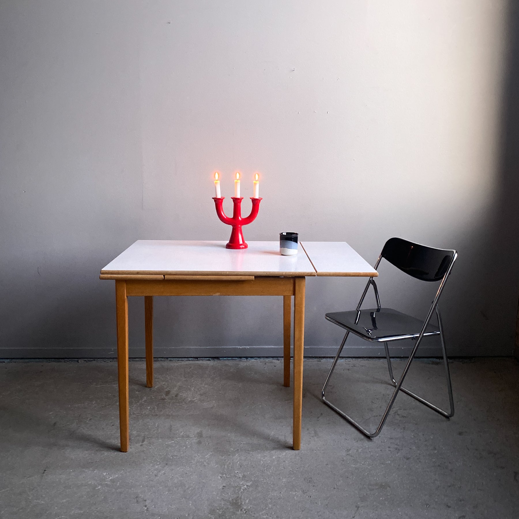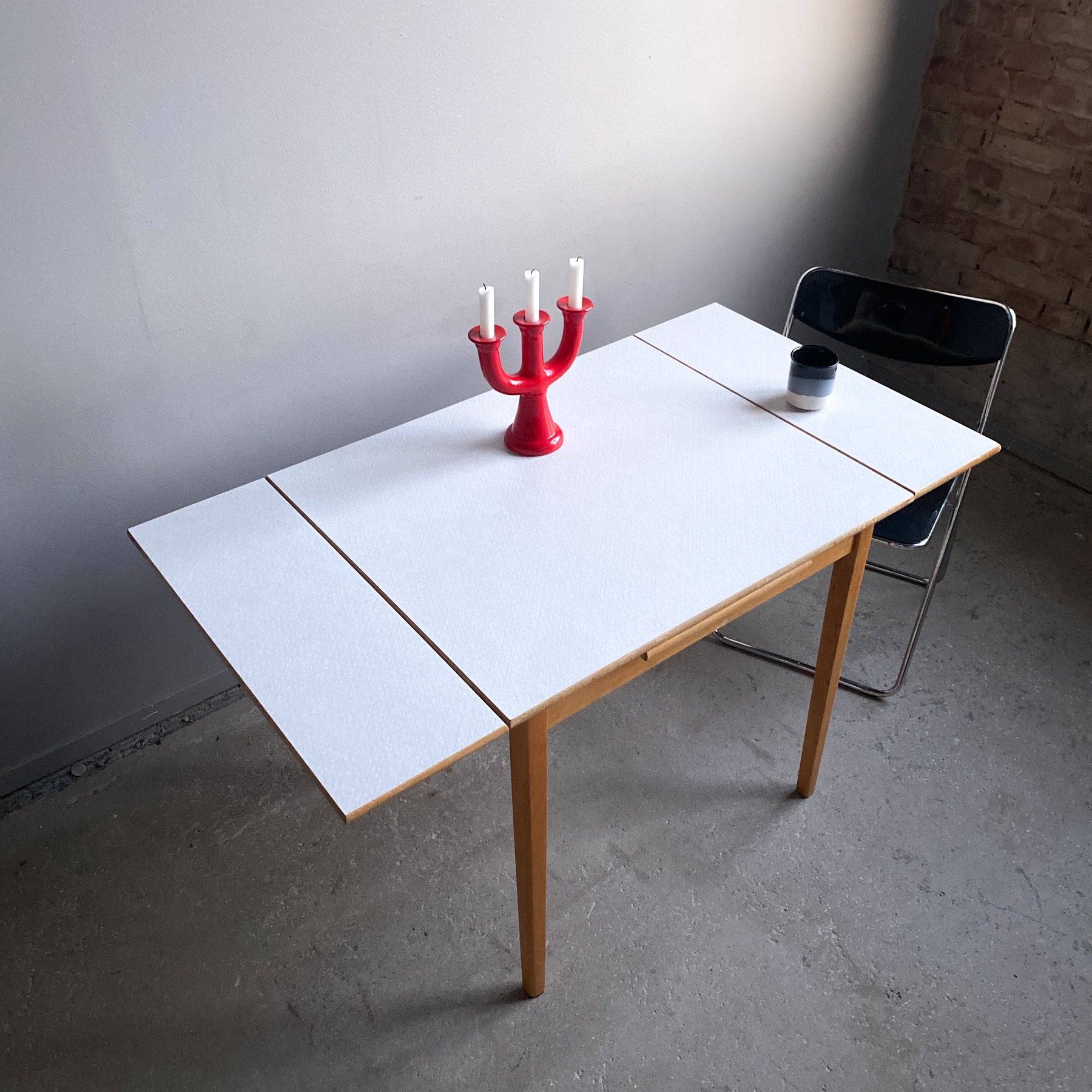 Fint litet bord till det lilla köket med två skivor att dra ut. Perstorpskiva och mönstret Virrvarr designat av Sigvard Bernadotte.