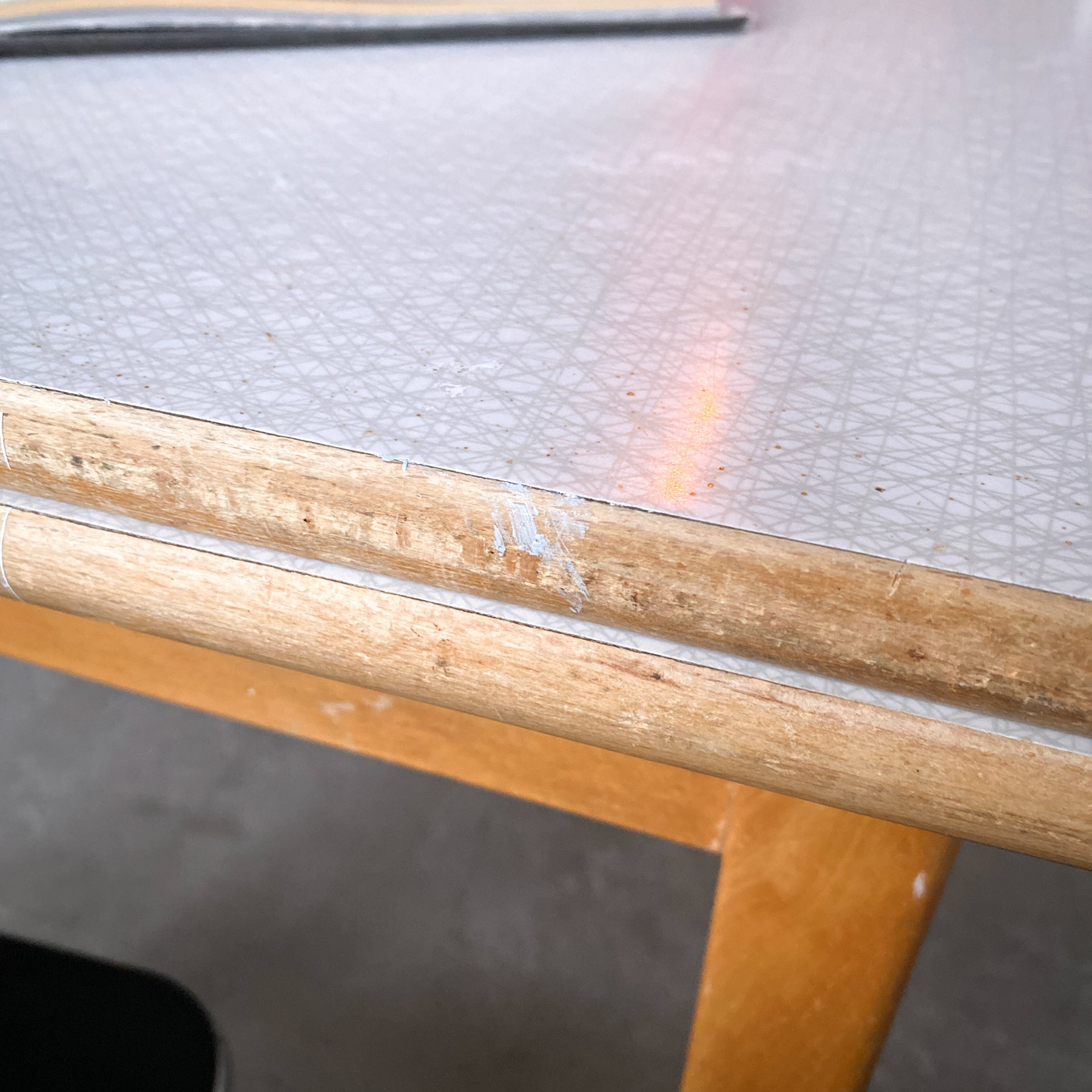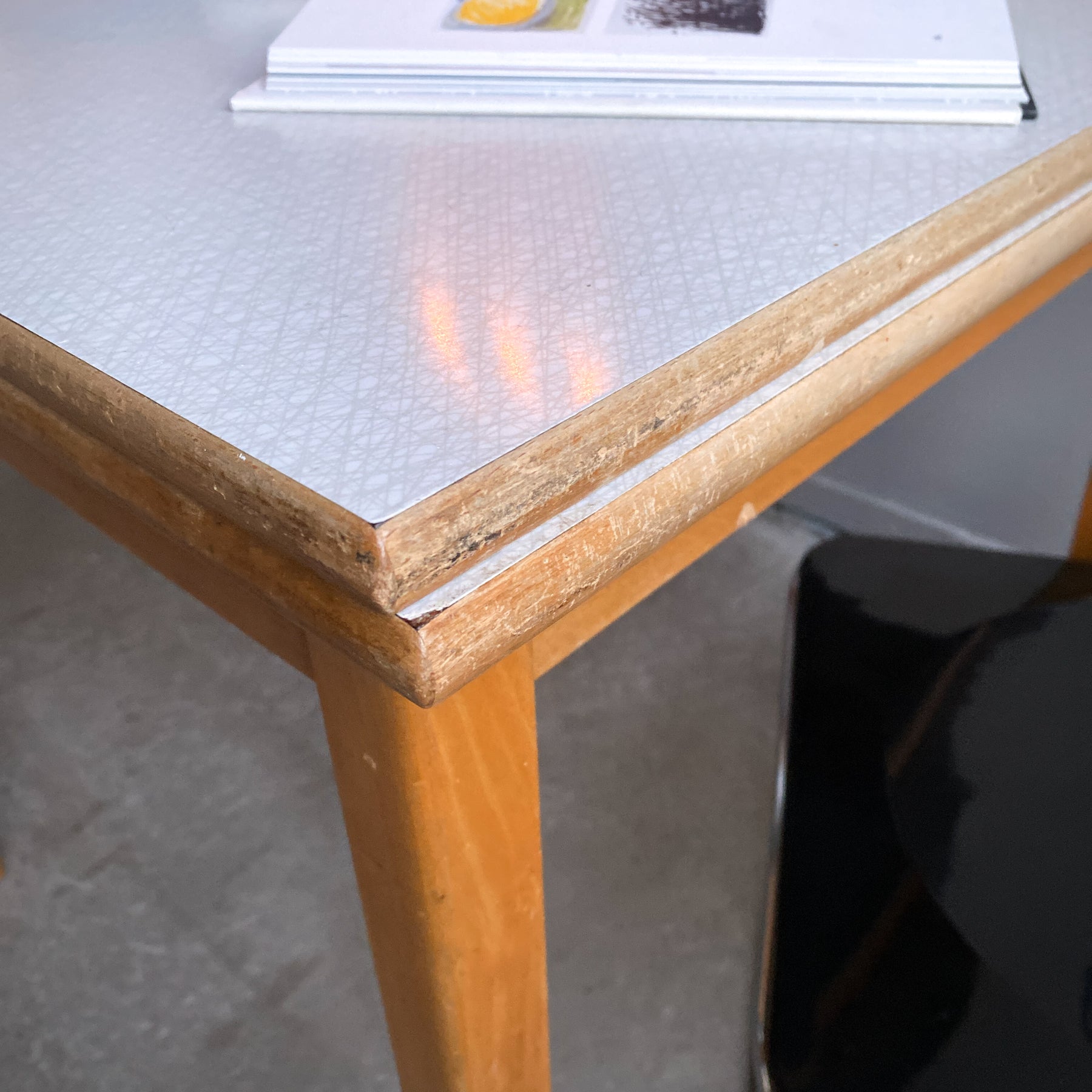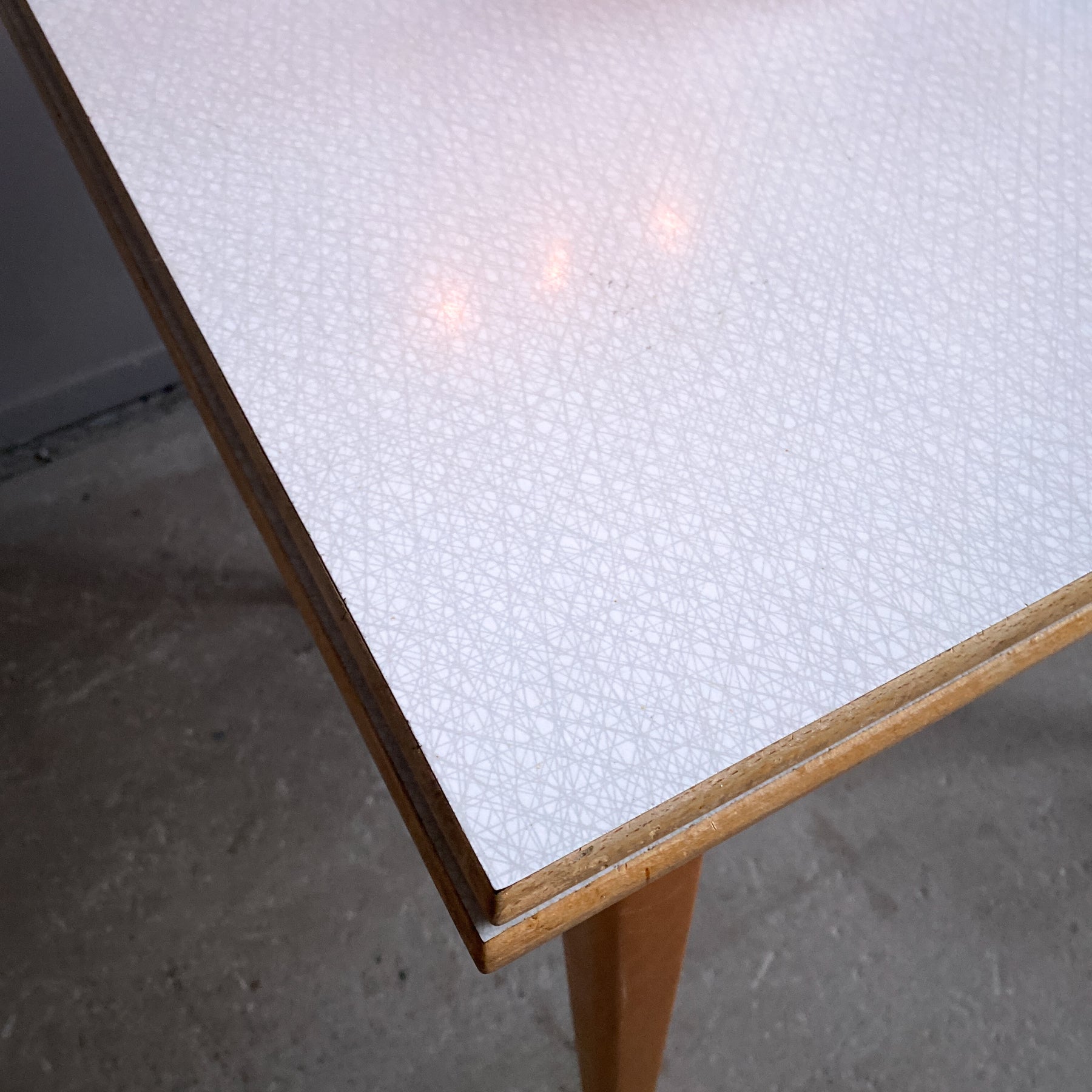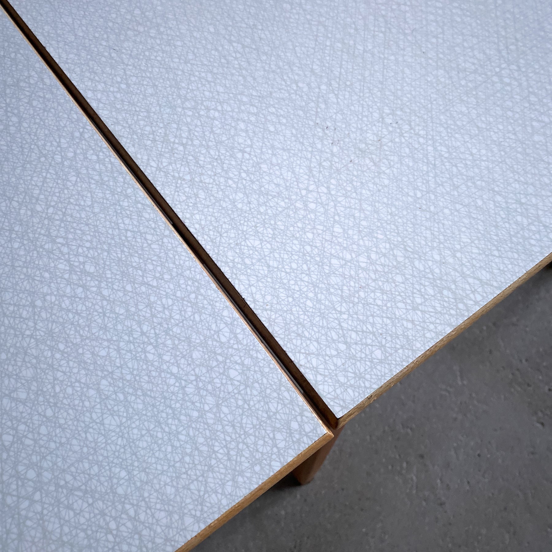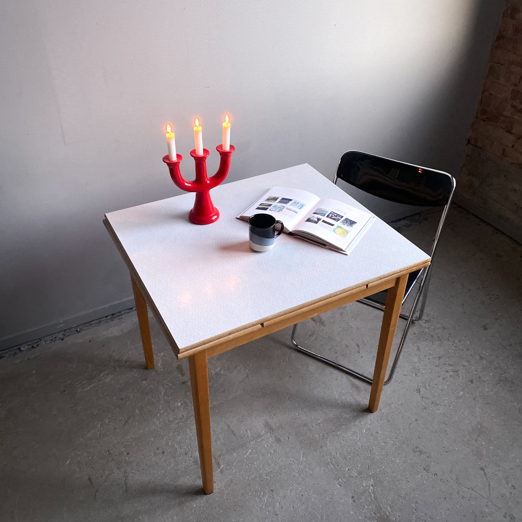 Fint litet bord till det lilla köket med två skivor att dra ut. Perstorpskiva och mönstret Virrvarr designat av Sigvard Bernadotte.