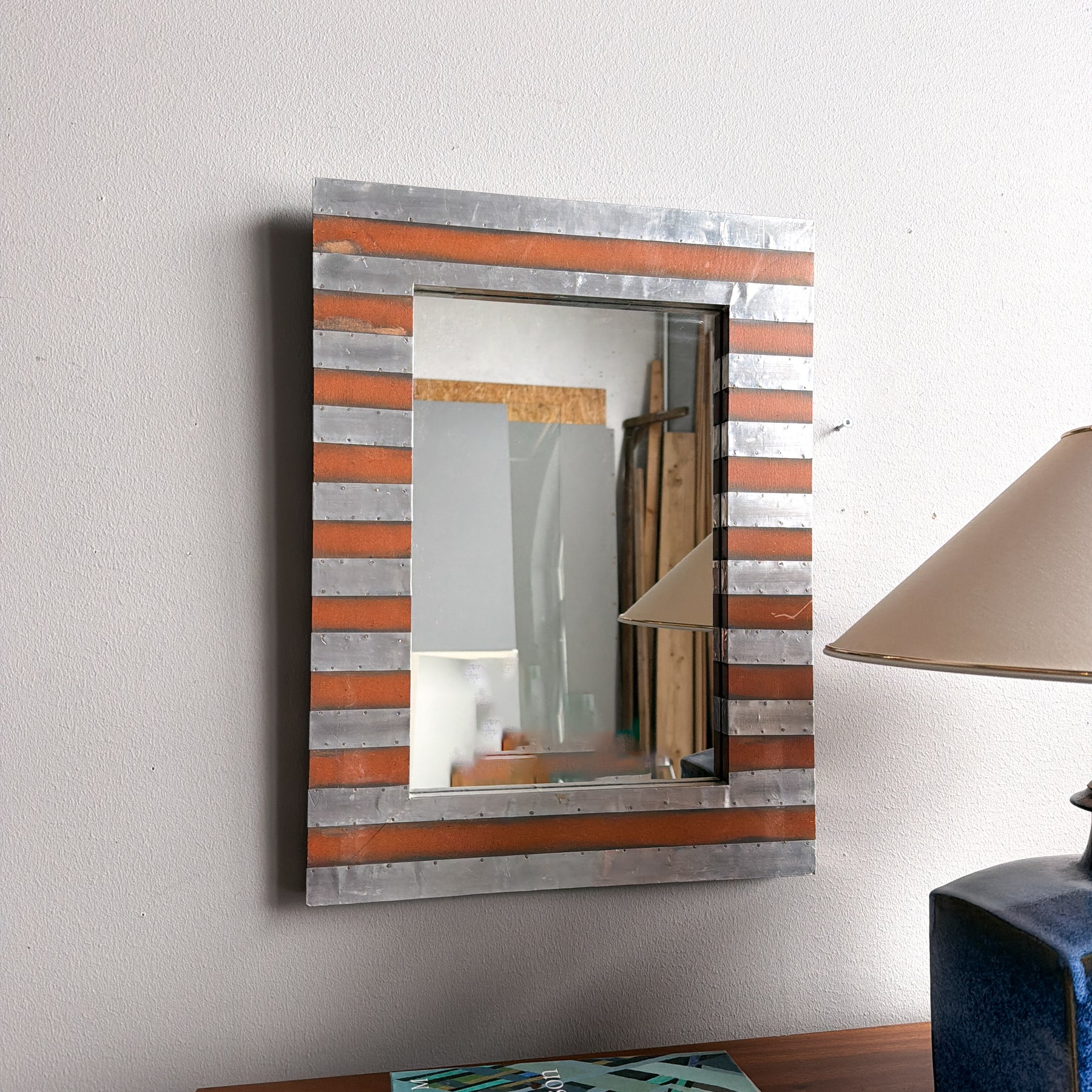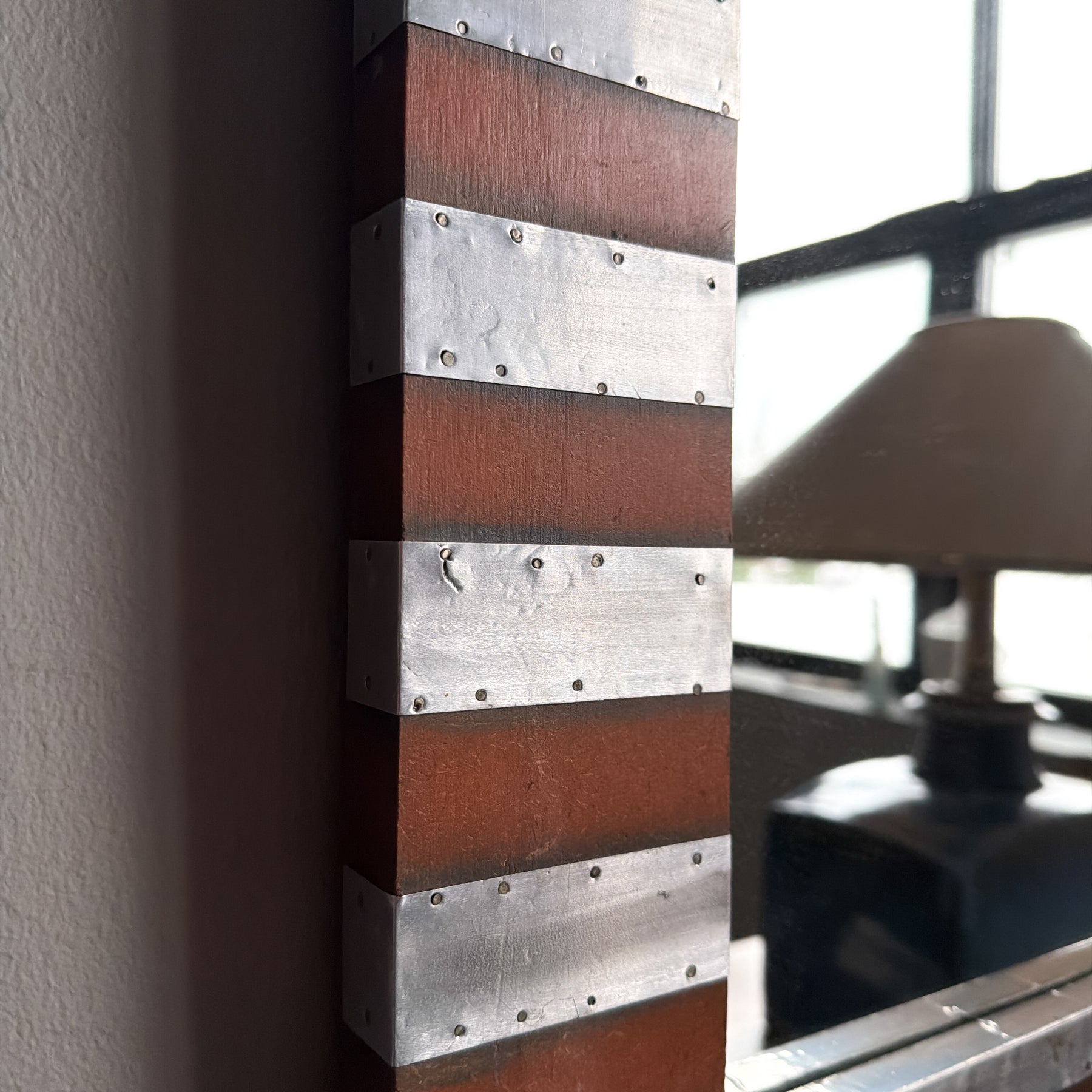 Spegel med ränder av metall. Stomme i trä. Går att hänga horisentellt. 90/tidigt 2000-tal.