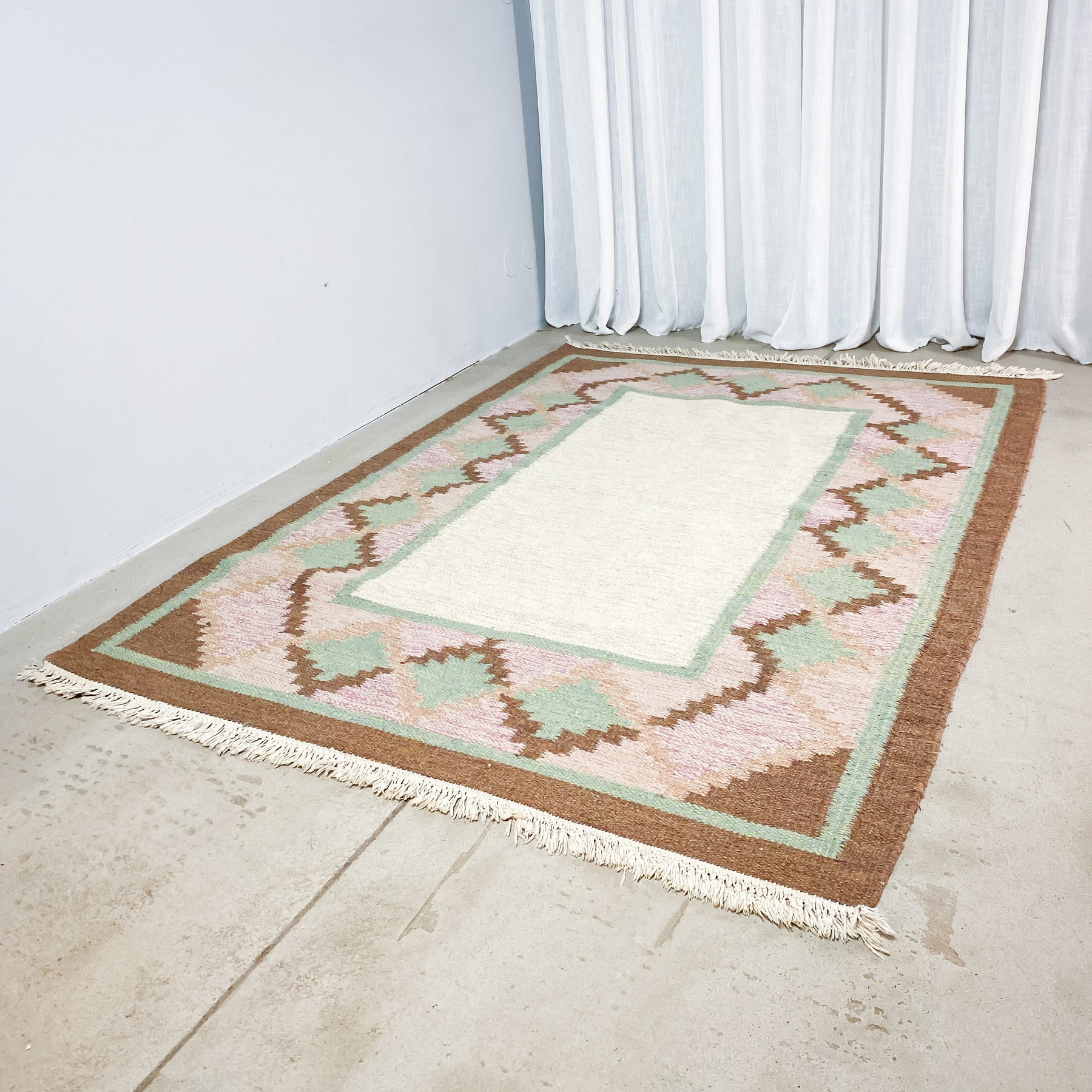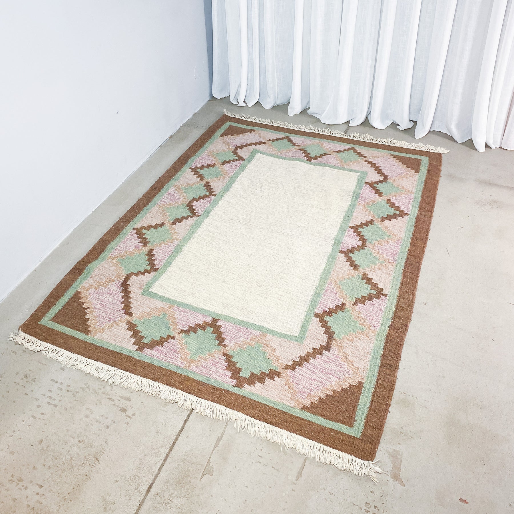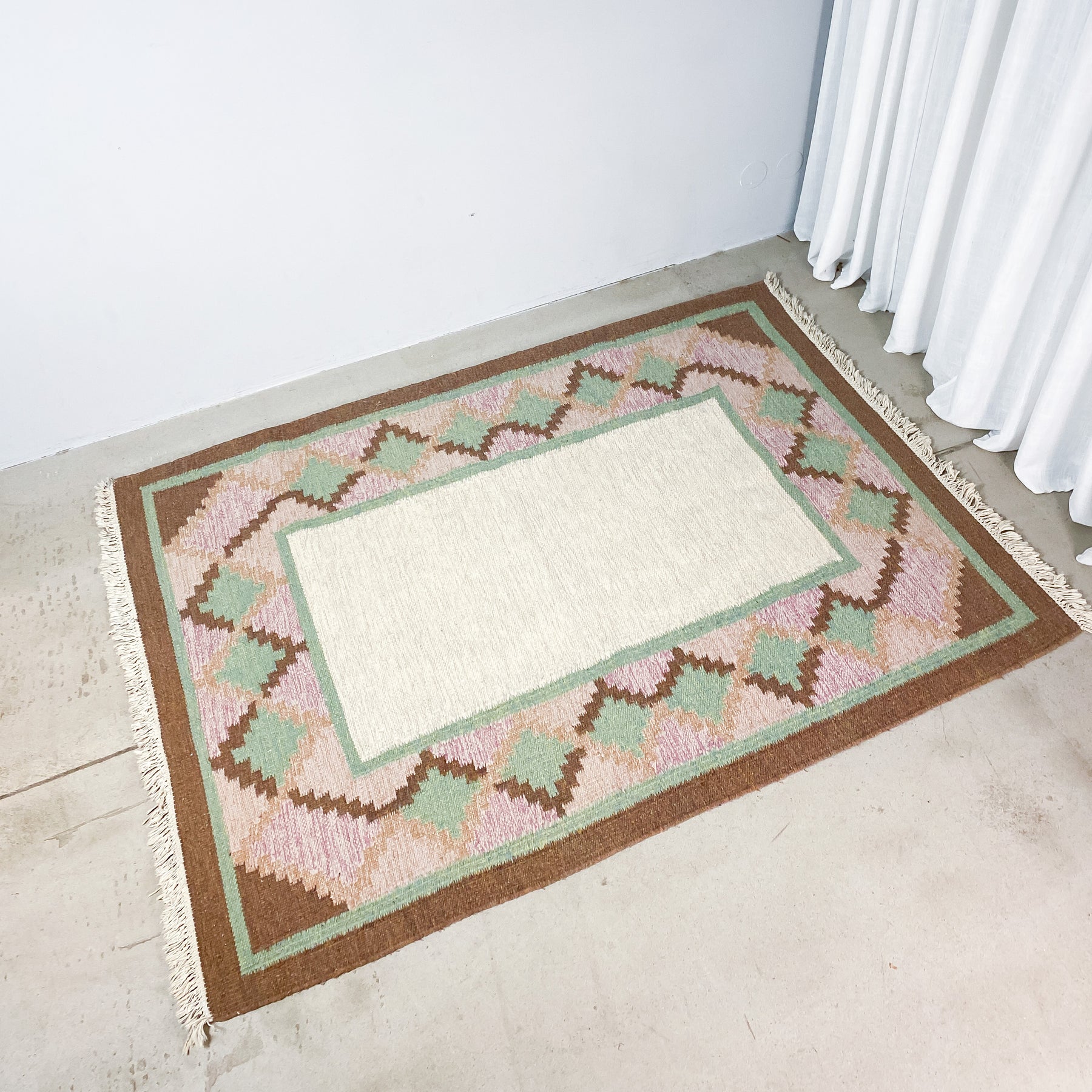 Röllakanmatta i blått, beige, rosa och grönt. Ingen signatur men väl så vacker ändå.