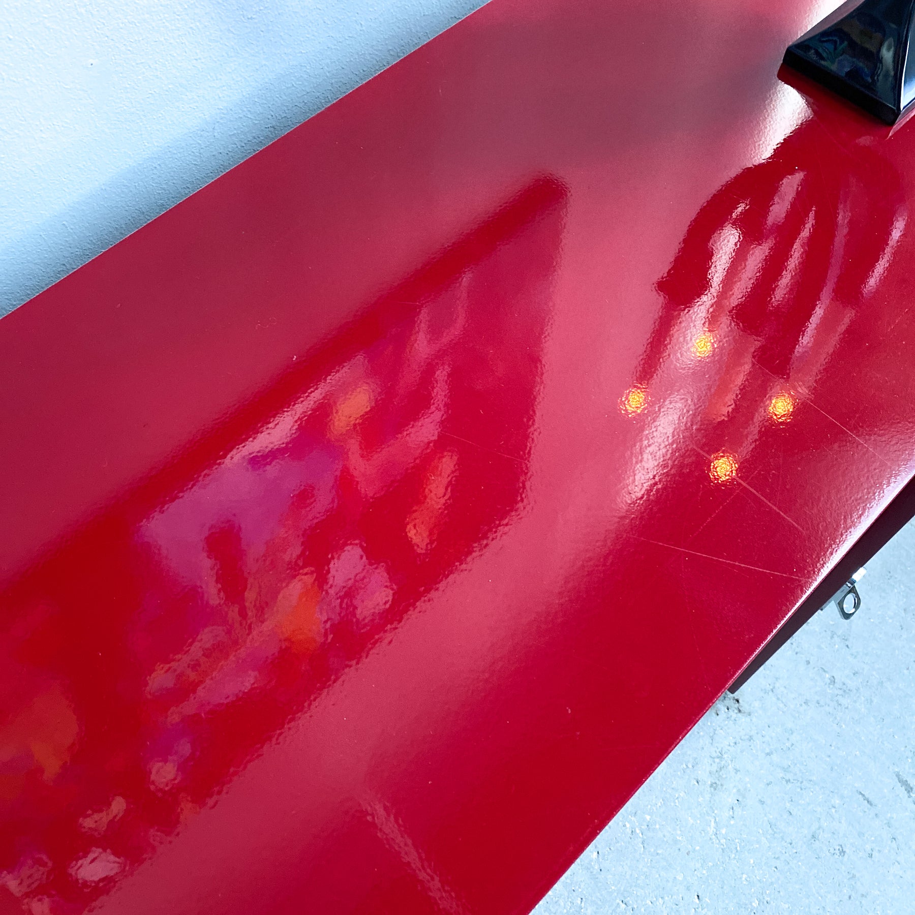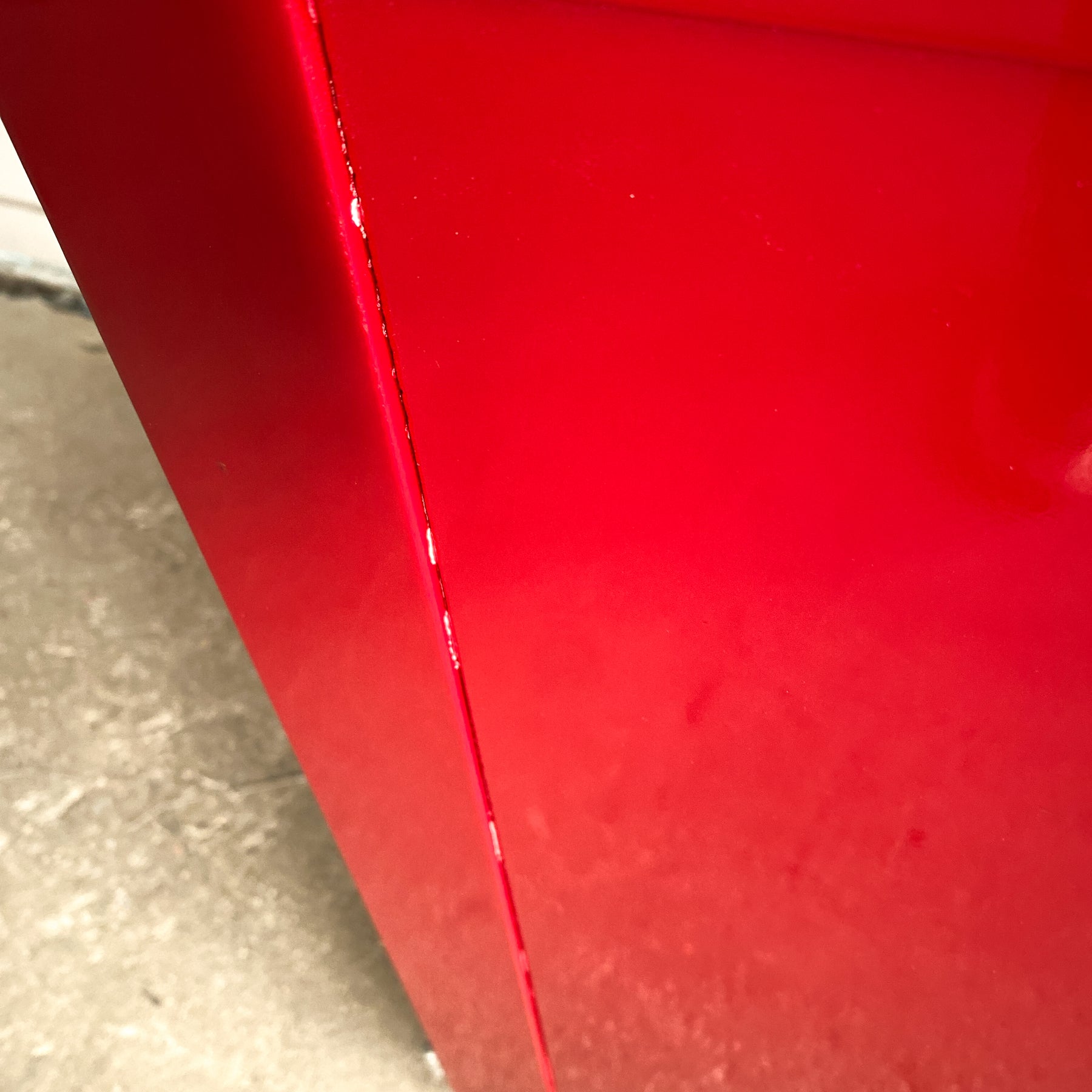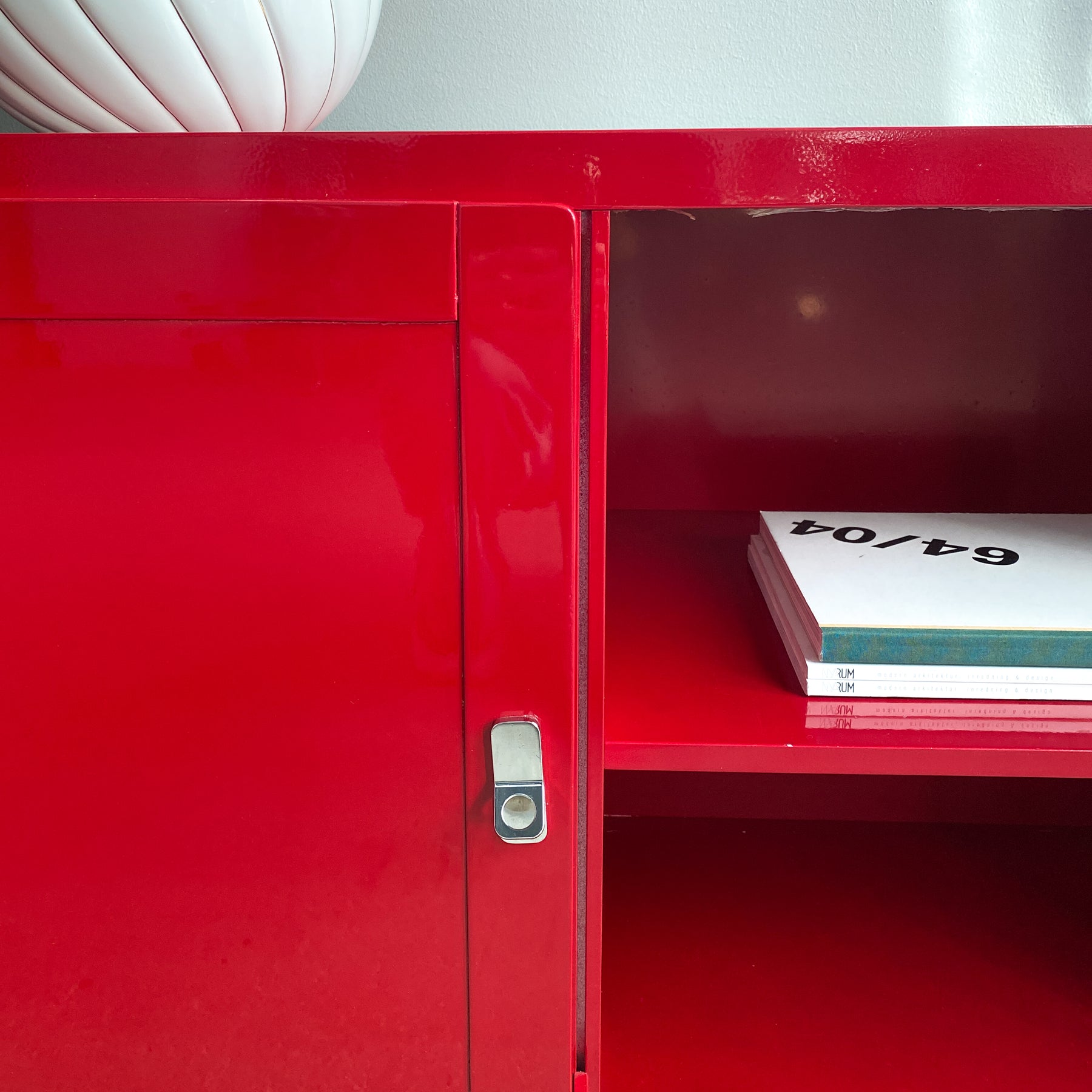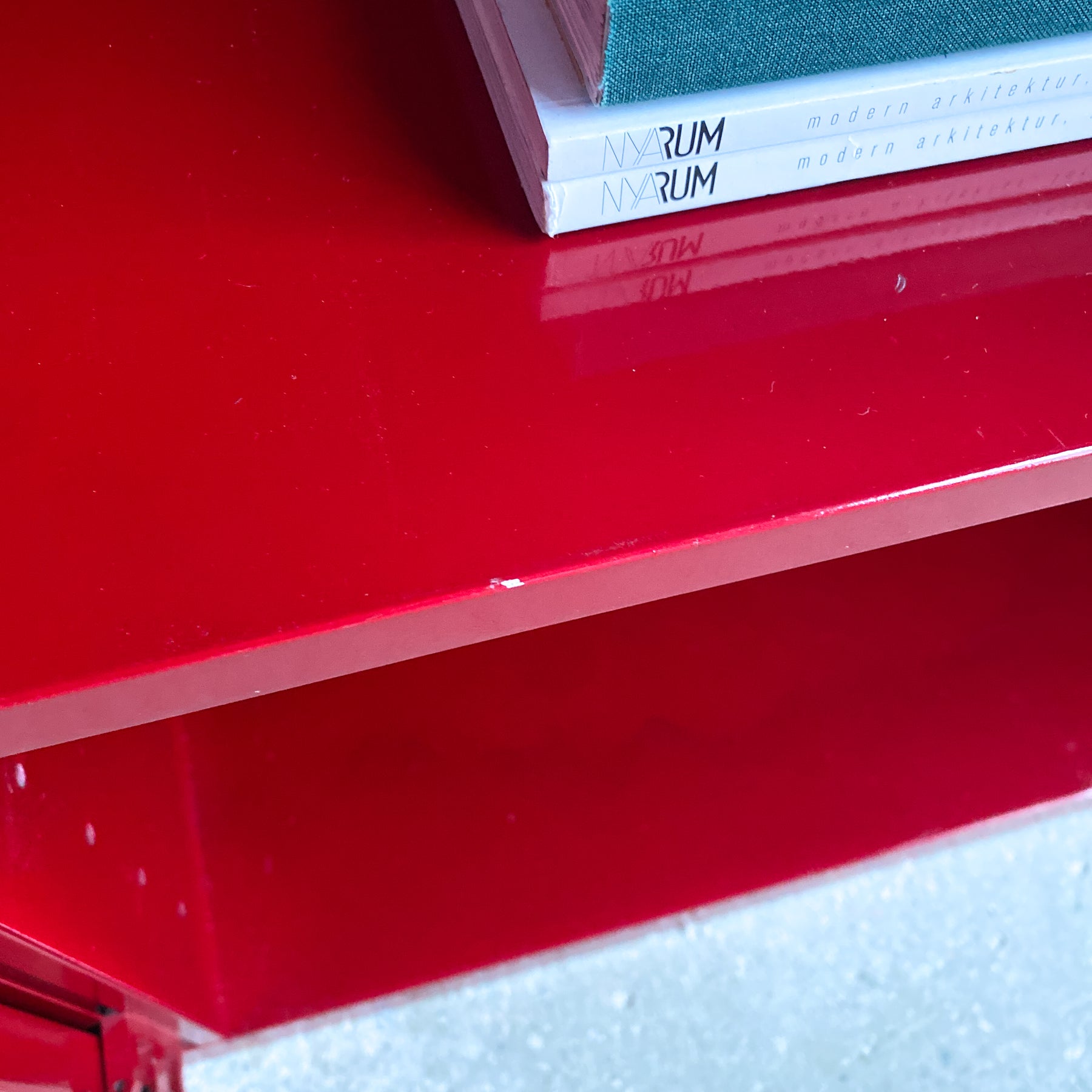 Sideboard från serien Avanti, designad av Antonio Gioia för DUX, 80-tal. Senare lackerat i en blodröd blank lack. Ett hyllplan i glas i ena skåpet, ett i trä i andra och ett hyllplan i mittendelen. Handtag i krom.