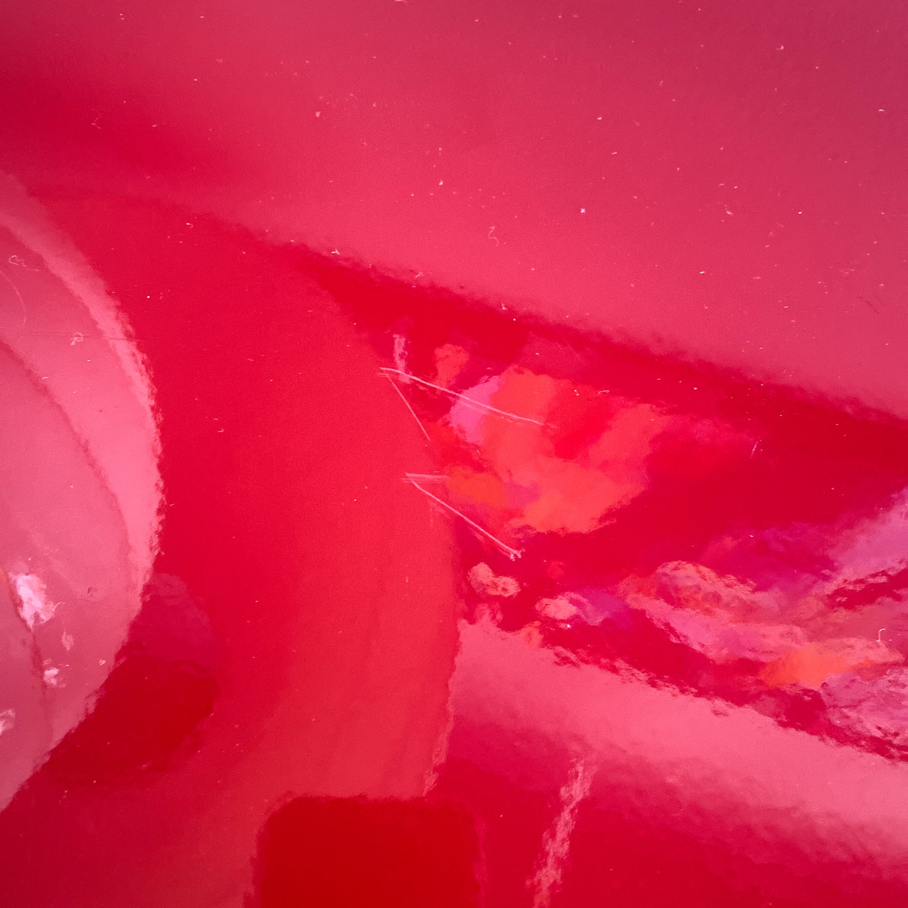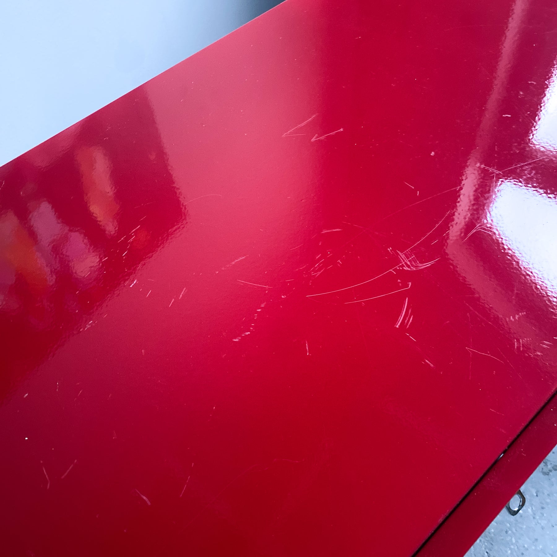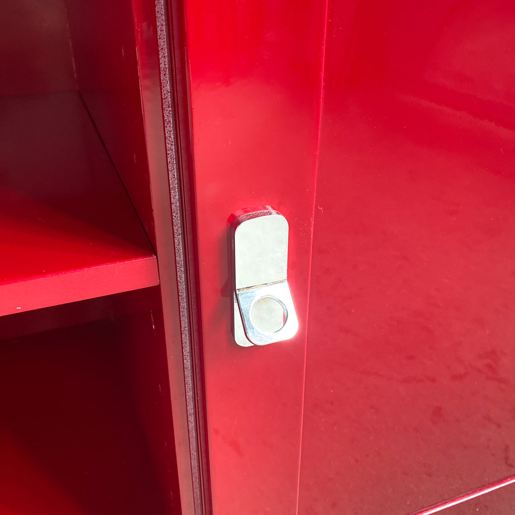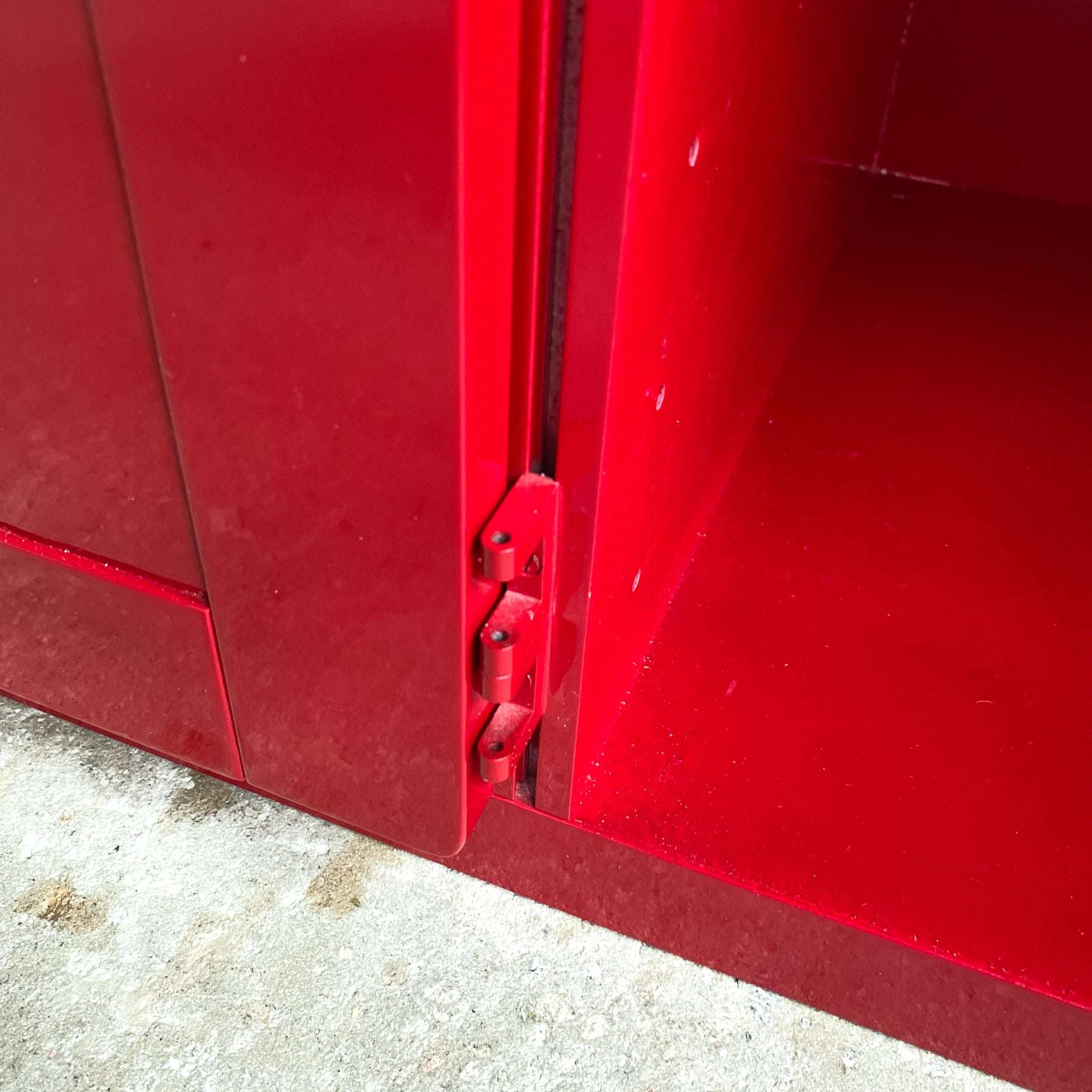Sideboard från serien Avanti, designad av Antonio Gioia för DUX, 80-tal. Senare lackerat i en blodröd blank lack. Ett hyllplan i glas i ena skåpet, ett i trä i andra och ett hyllplan i mittendelen. Handtag i krom.