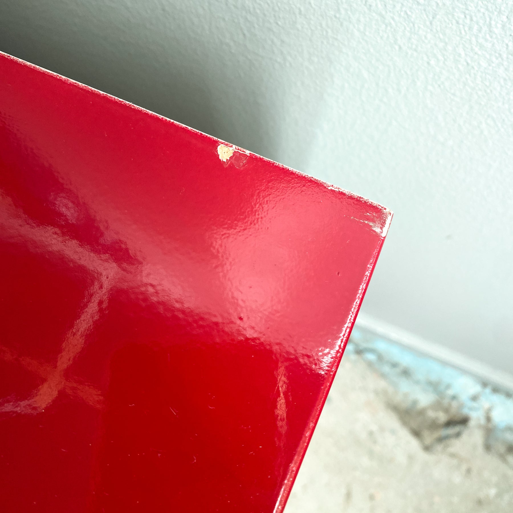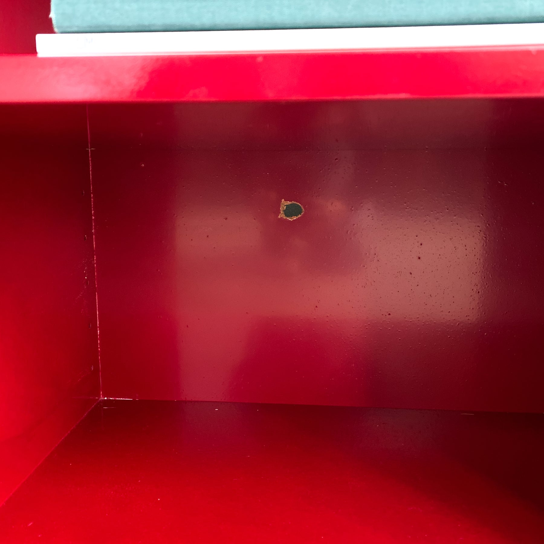 Skick: Spår av liv i form av mindre färgbortfall och repor. Senare lackerat i rött. Utsågat på baksidan inne i skåpet till vänster och under hyllan i mitten. Överlag fint vintageskick.