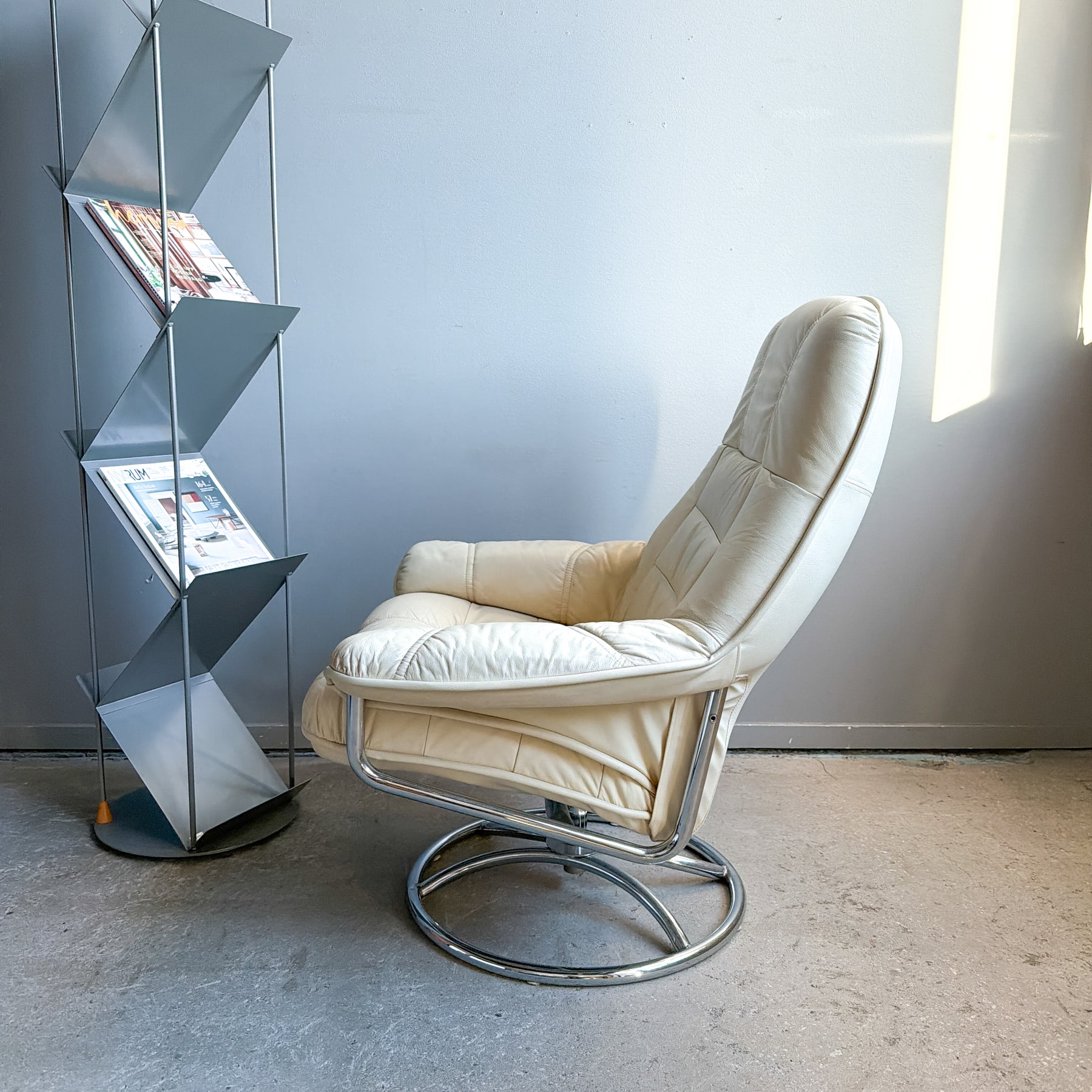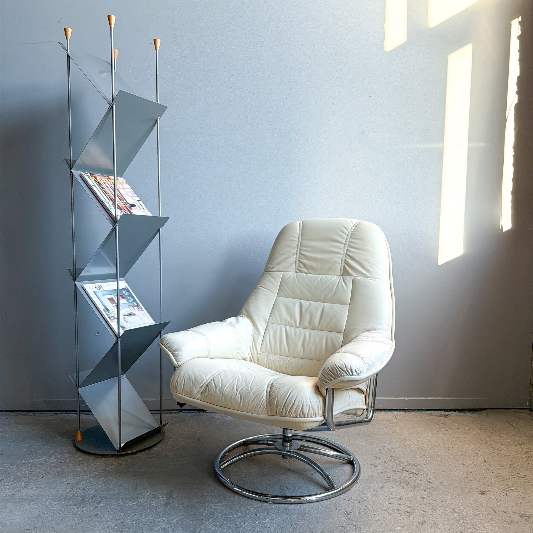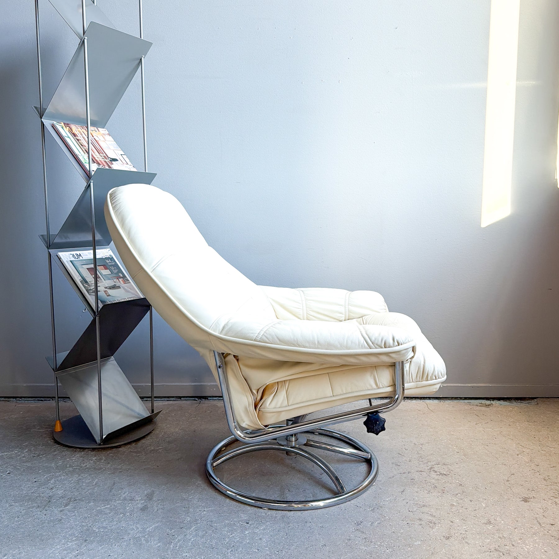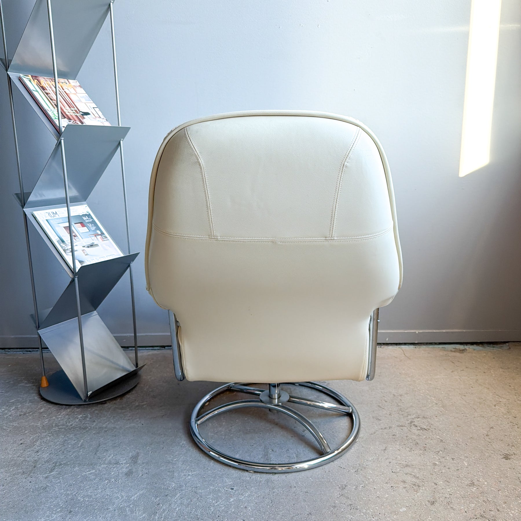 Snurrfåtölj i vitt skinn, 80-tal
