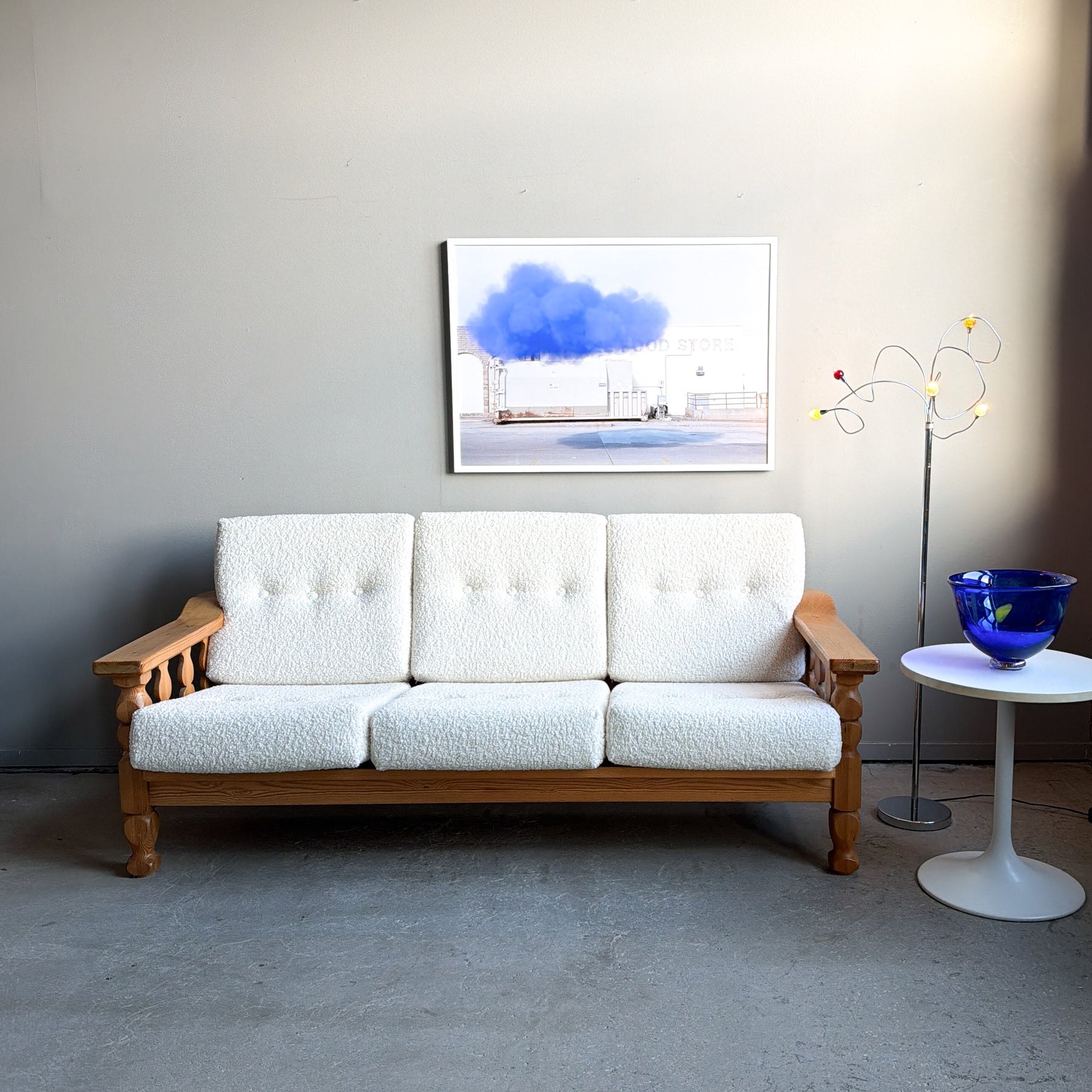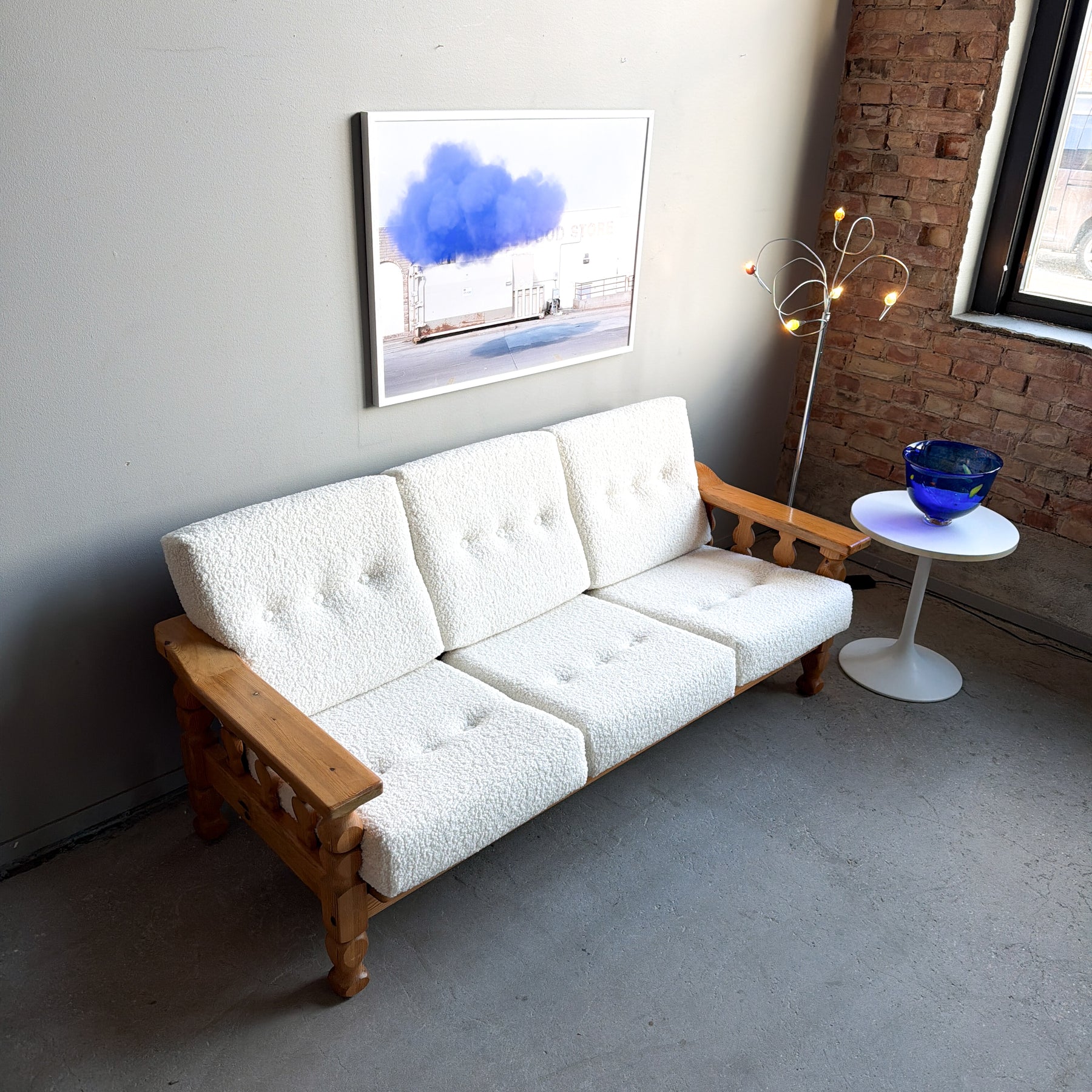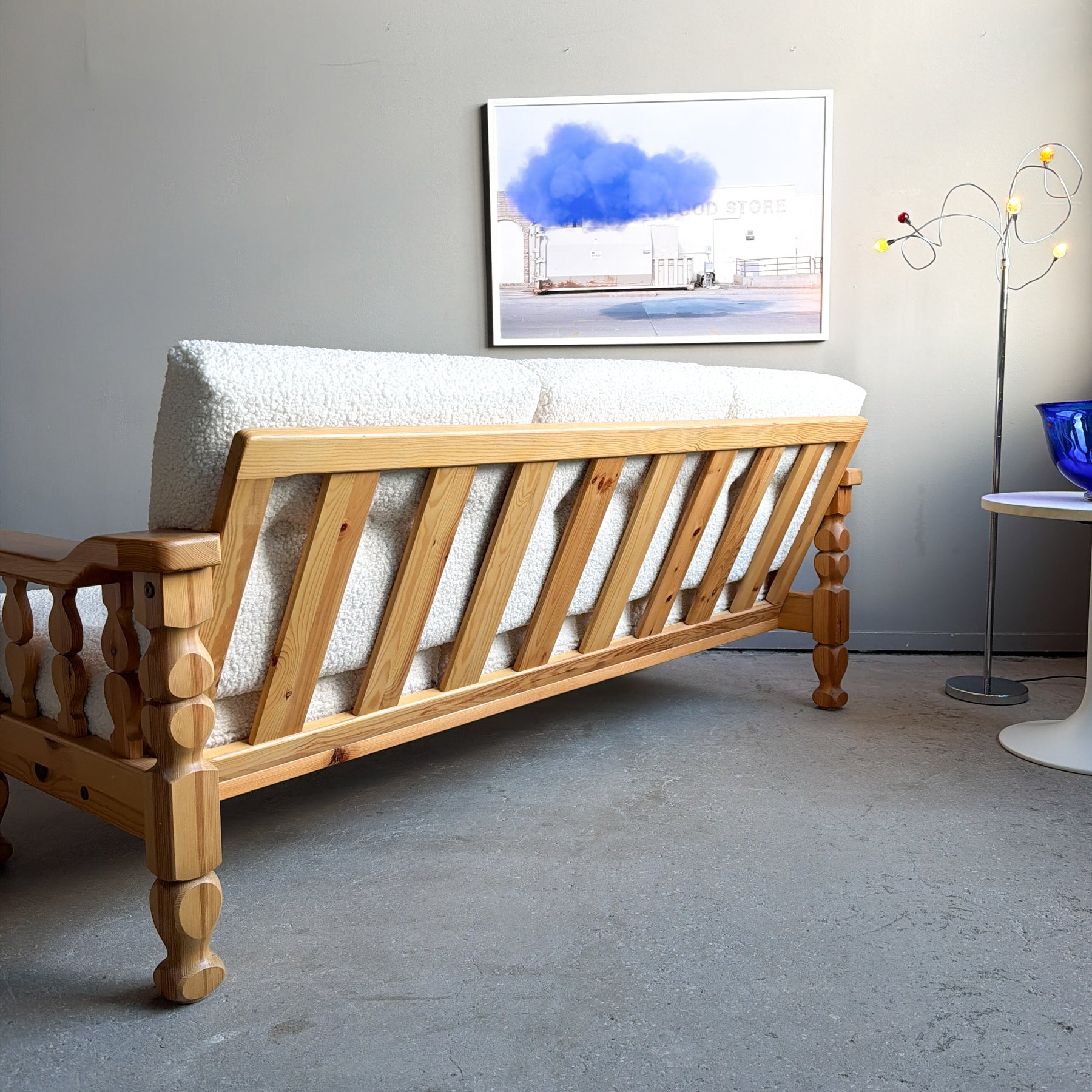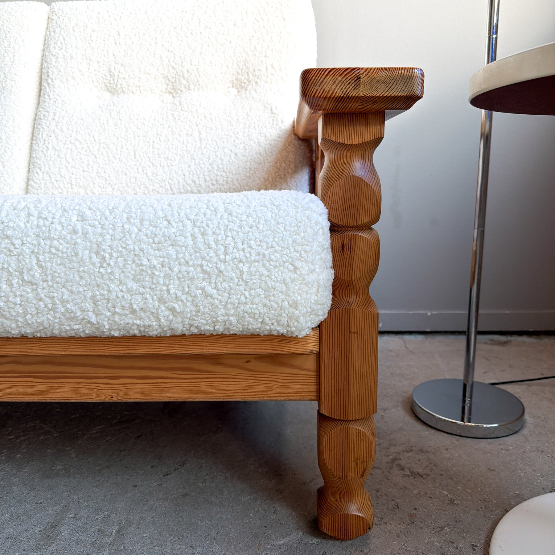 3-sits soffa i massiv furu med nytapetserade dynor i cremevit fårskinnsimitation. Stomme med svarvade ben och sidostycken. 70-tal.