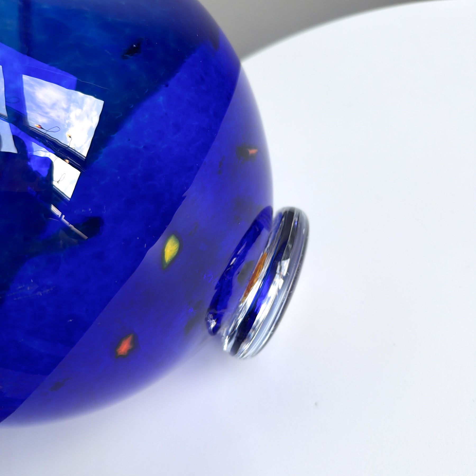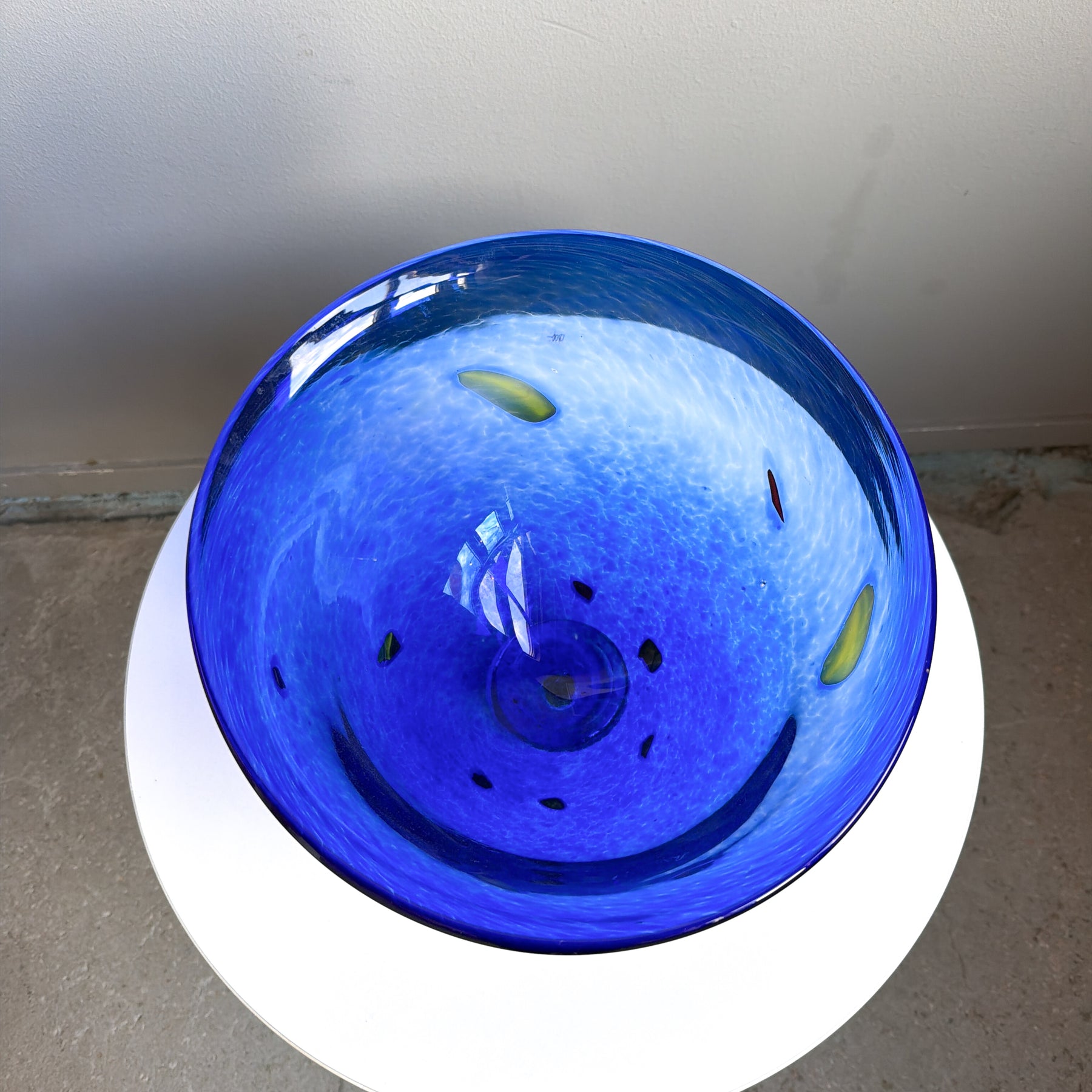 Stor glasskål i blått glas med prickar i gult, rött och grönt.