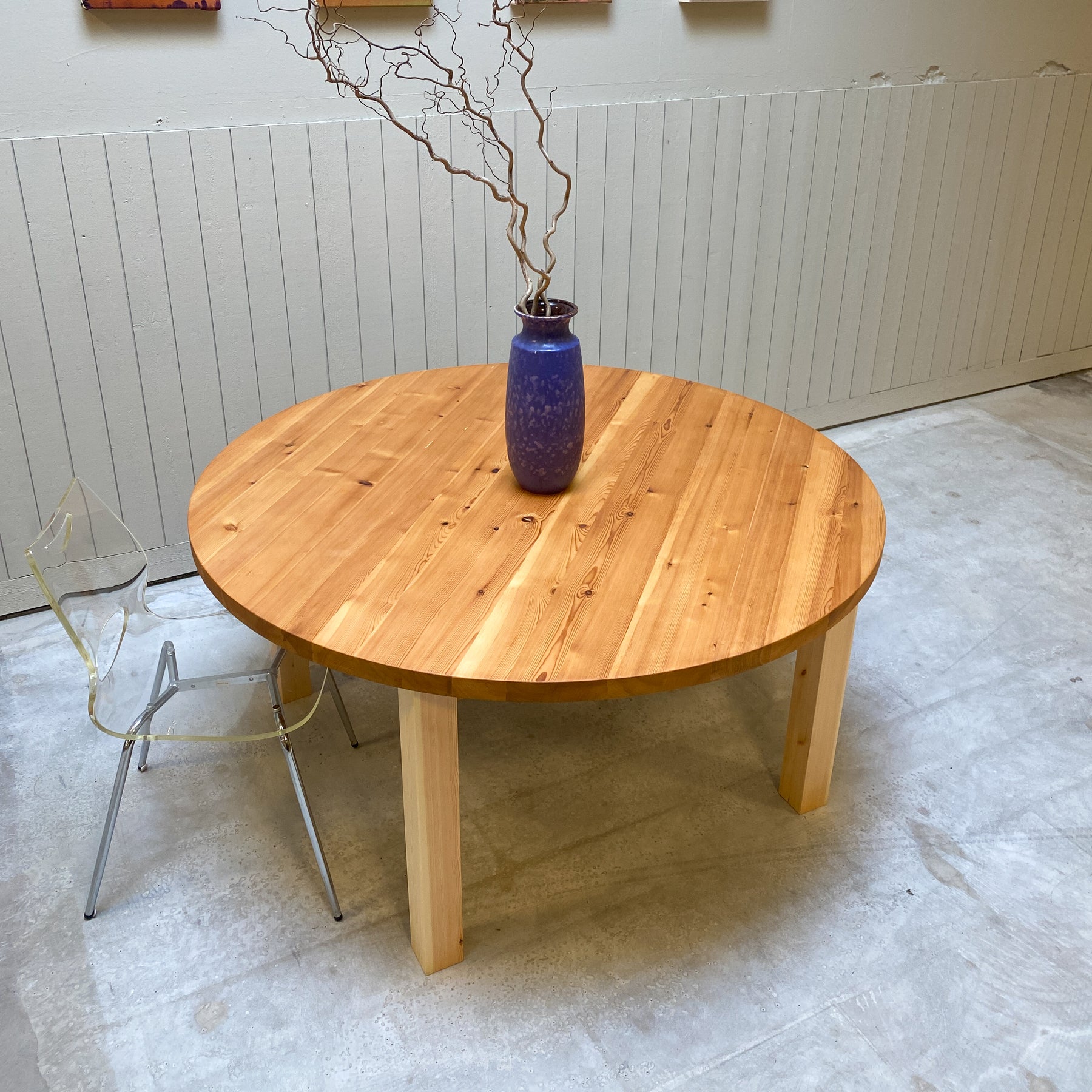 Stort runt matbord i massiv furu, 70-tal. Nyrenoverat och behandlat med matt hårdvaxolja. Nytillverkade ben. Tungt! Endast avhämtning i butiken.