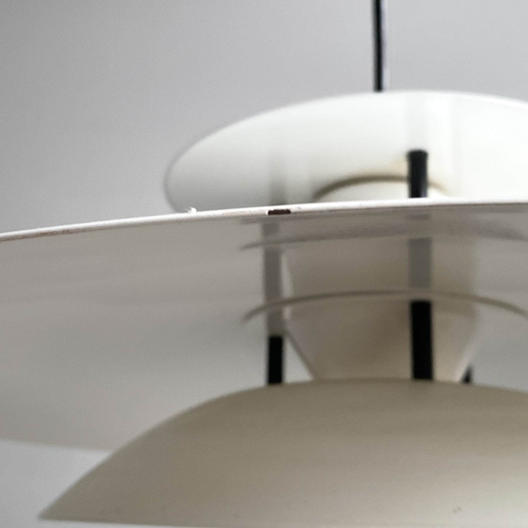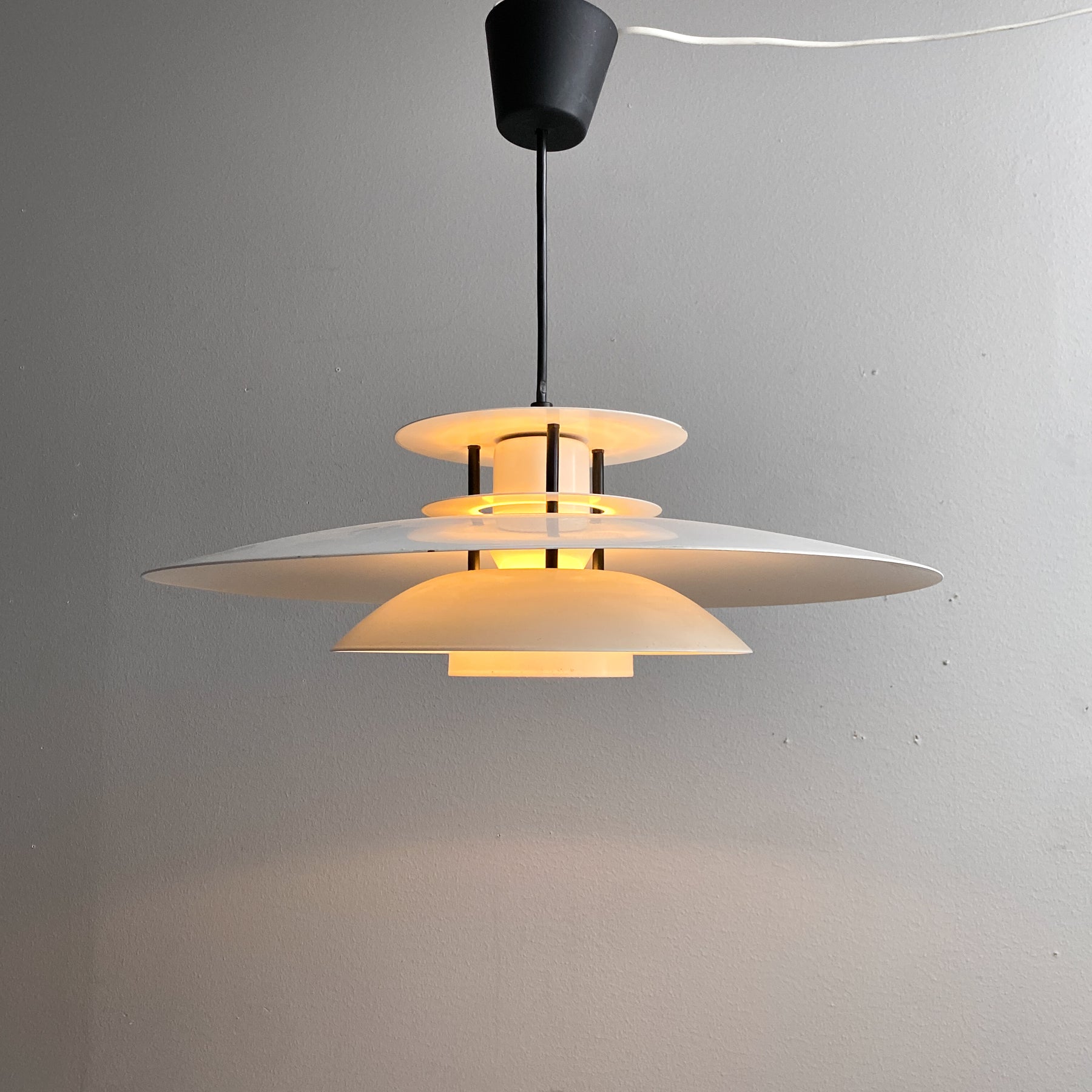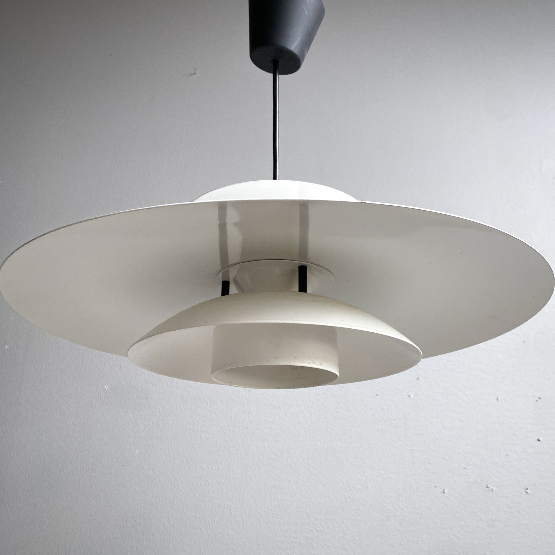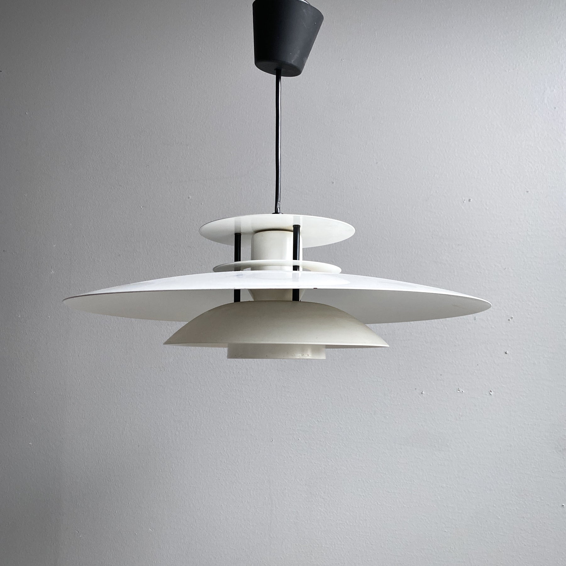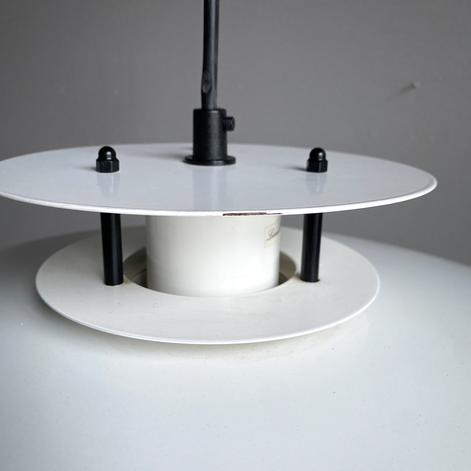 Taklampa i vit plåt och svarta detaljer. För att byta ljuskällan skruvar man av översta delen (de svarta skruvarna) Tung och gedigen. Går att byta den svarta sladden om man vill ha den hängande tex över ett matbord. Gjuten ojordad takkontakt.